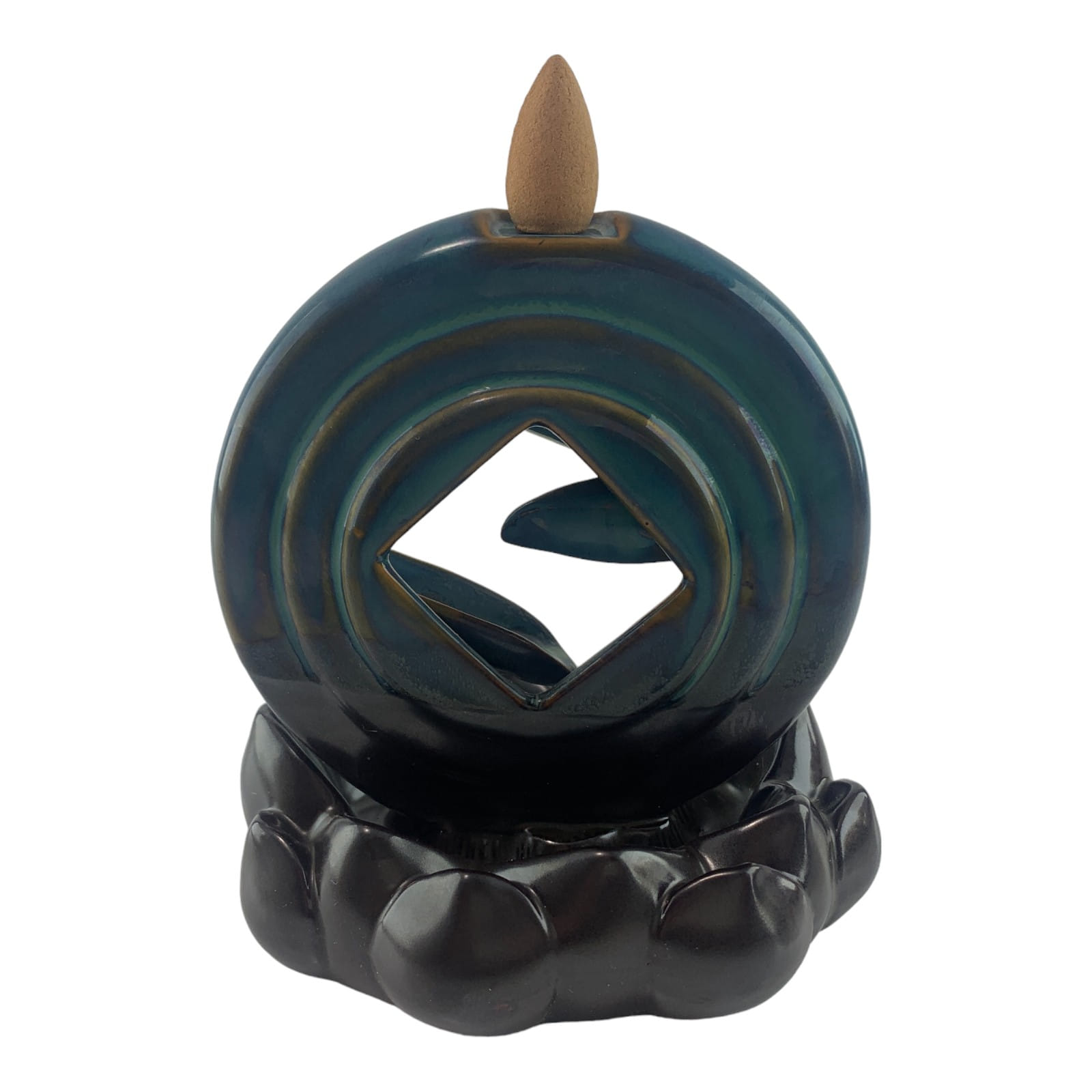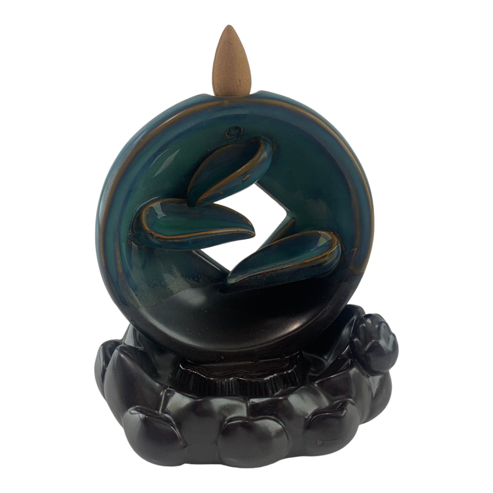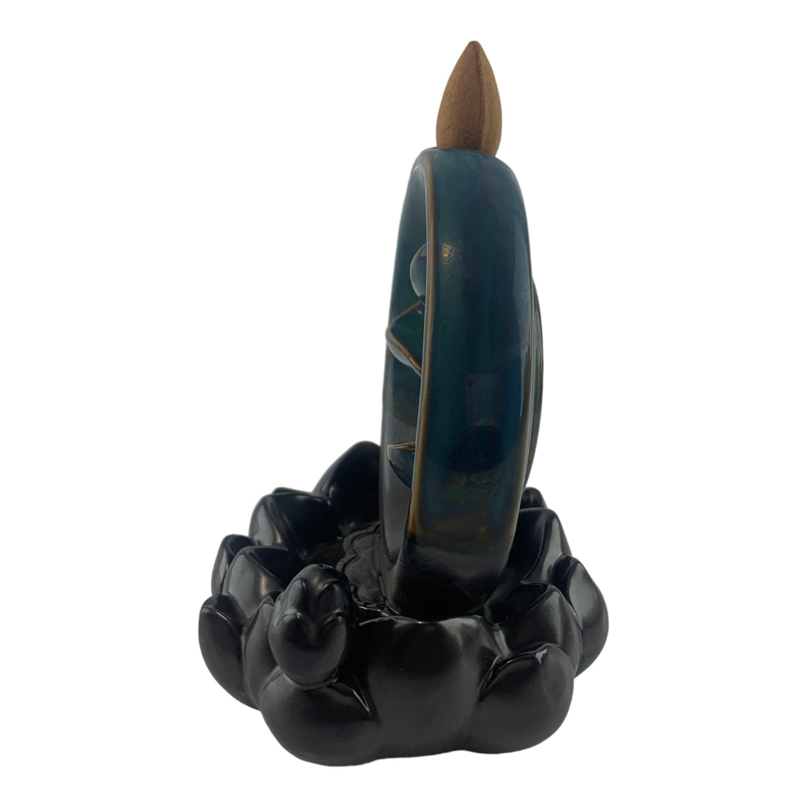 Круглая форма с лепестками, по которым льется дым, придает подставке изысканный вид. Верхняя часть выполнена в бирюзовом цвете, плавно переходящем в теплый коричневый оттенок внизу.