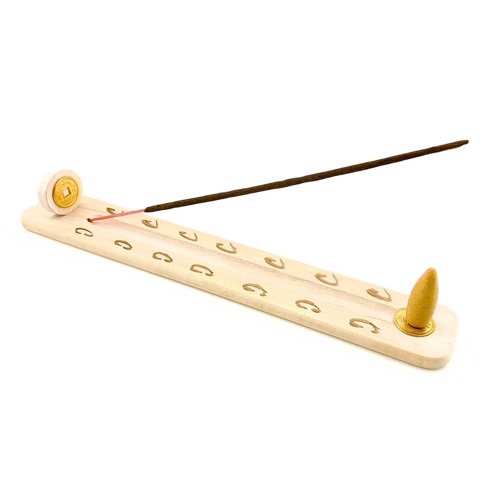 На нашей подставке также присутствует китайская монетка, на которую безосновное благовоние закрепляется. Это позволяет удобно и надежно размещать благовоние на подставке.