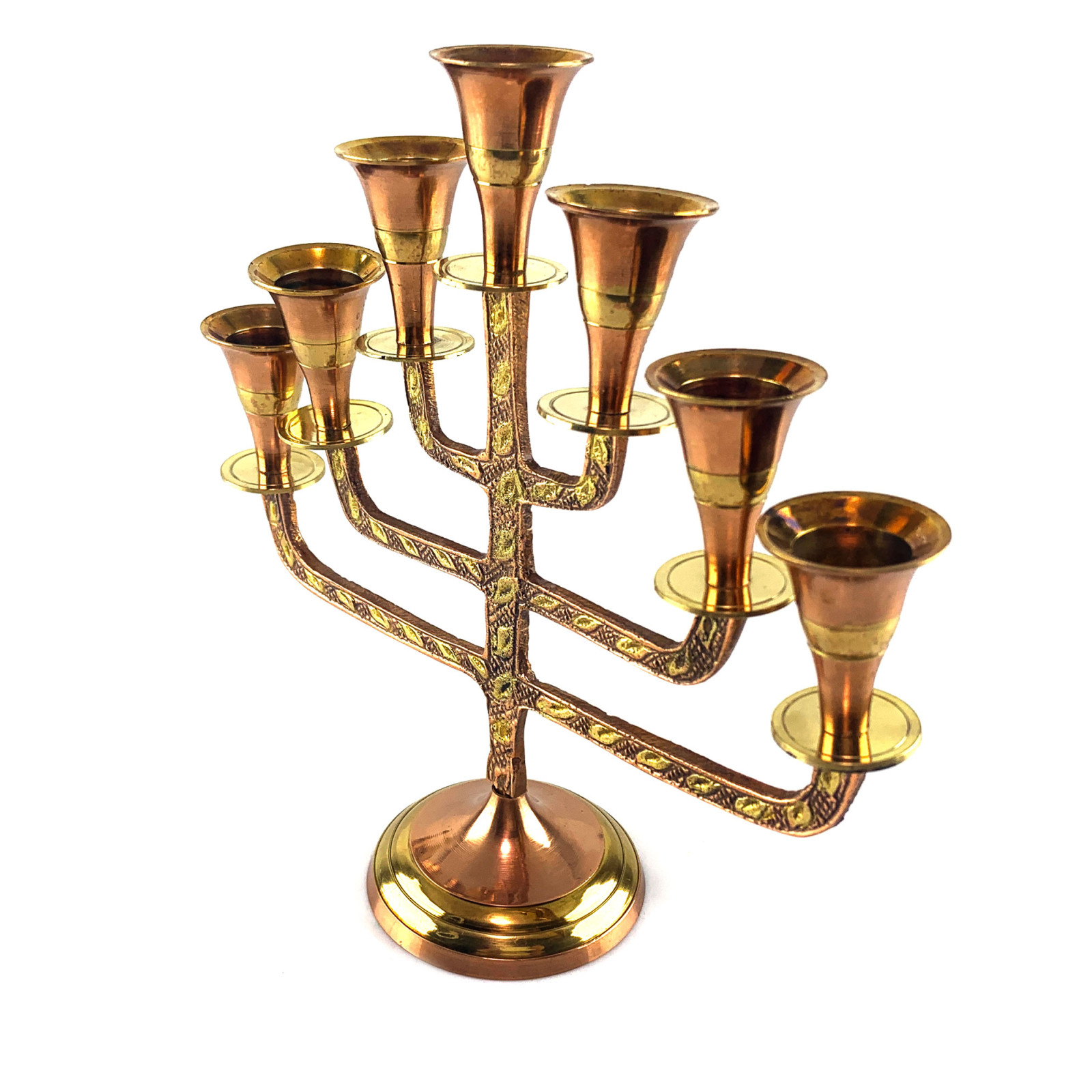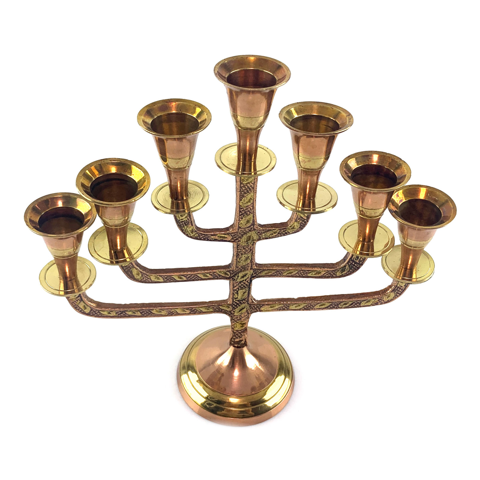 Подсвечник менора выполнен из бронзы и омеднен, что придает ему изысканный и роскошный вид. На его поверхности изображены золотистые листики на медном фоне, придающие ему неповторимую красоту и элегантность.