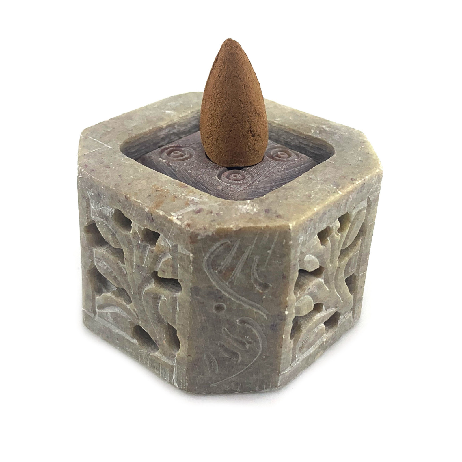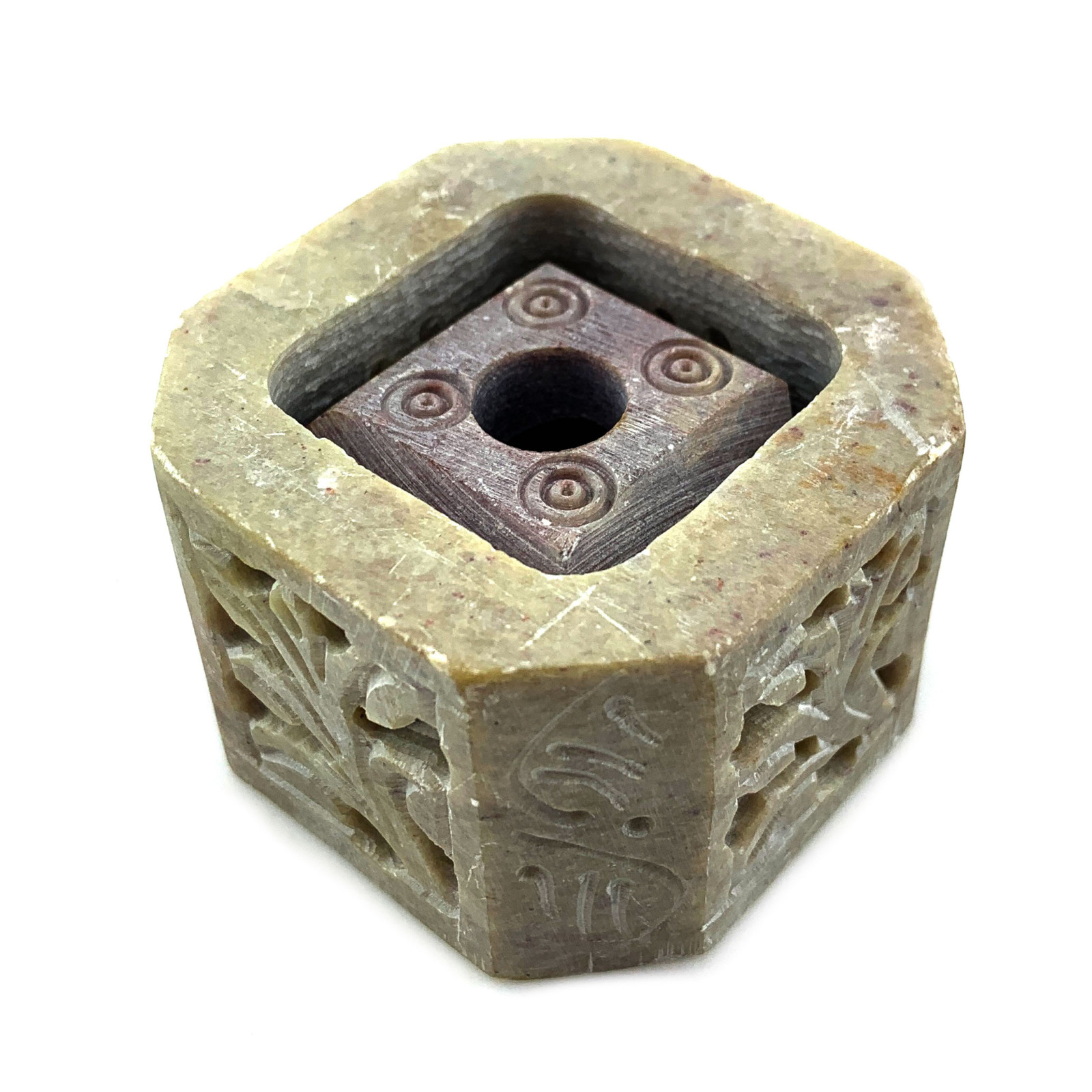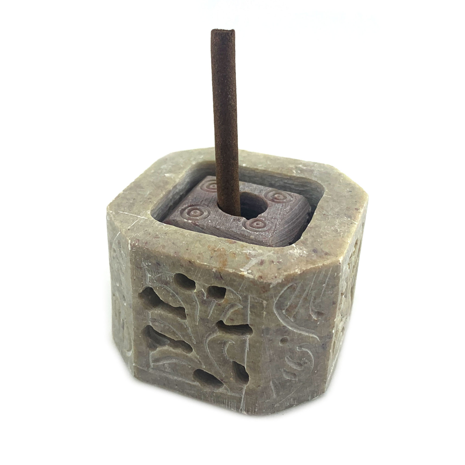 Внутри подставки находится куб со сглаженными углами размером 34х34 мм. Куб оборудован отверстиями для самых разнообразных благовоний: безосновных, конусов, палочек и даже свечей.