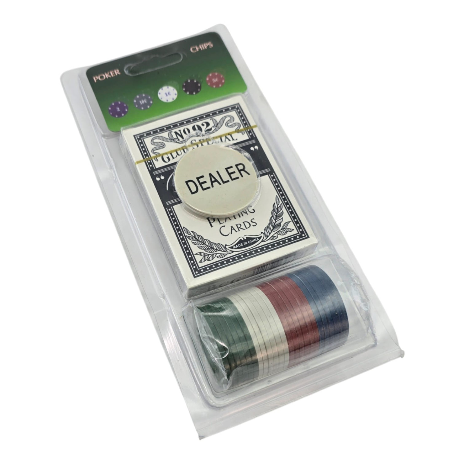 Компактный комплект для домашних игр. В наборе 40 пластиковых фишек смешанных номиналов и цветов, стандартная колода 54 карты и круглый жетон Dealer. Подходит для Техасского Холдема, Омахи и других игр. Удобно брать с собой или дарить любителю настольных игр. Обратите внимание: цвета и номиналы фишек в партиях могут отличаться от фото. Производство Китай.