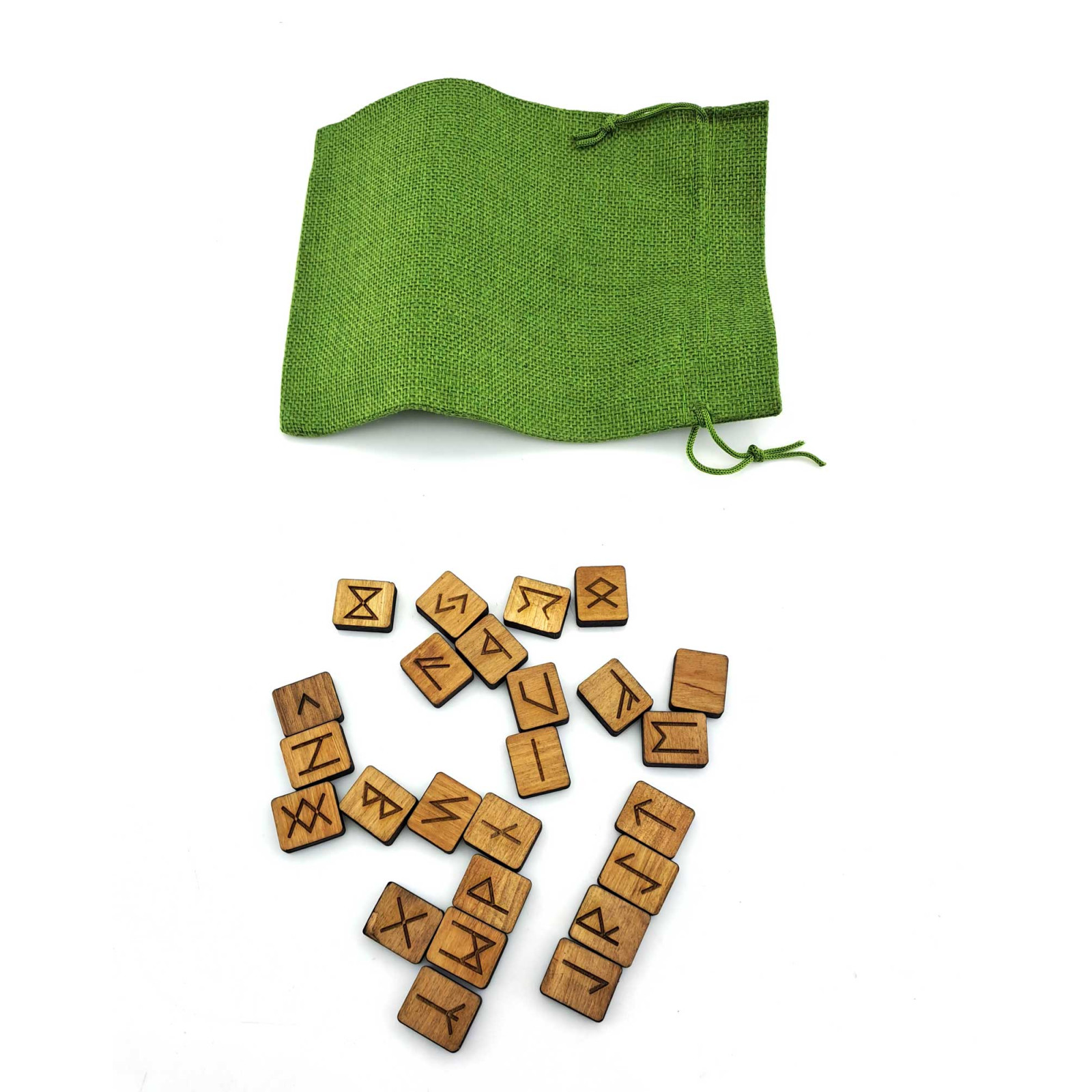 Руны из ольхи в мешочке. Подарочный мешочек из мешковины на затяжках, цвет зелёный, 15×20см. Размер руны -31*27*7 мм. В наборе 25 рун и описание: значение рун и техника гадания. Руны из ольхи покрыты льняным маслом и пчелиным воском. Руны – древняя скандинавская и славянская письменность. Каждая буква в скандинавском руническом алфавите имела свое название и значение. Сами скандинавы считали, что руны обладают мощной энергетикой и большой силой, поэтому использовали их для гадания и защиты.