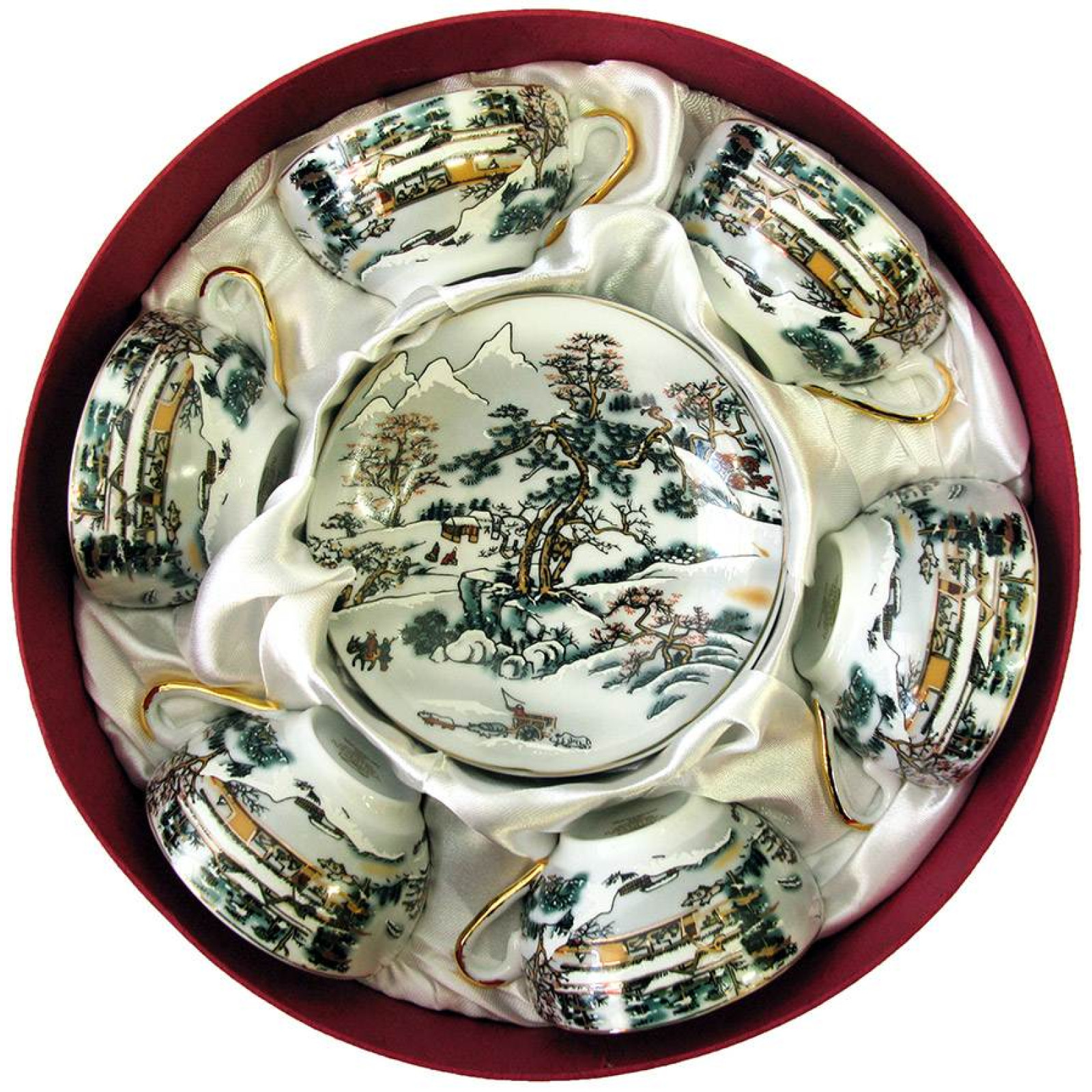 Сервиз круглый фарфор (70мл.)(6CCS97) "Зимний пейзаж" (h-4см, d-7,3см,d блюдца 11 см)