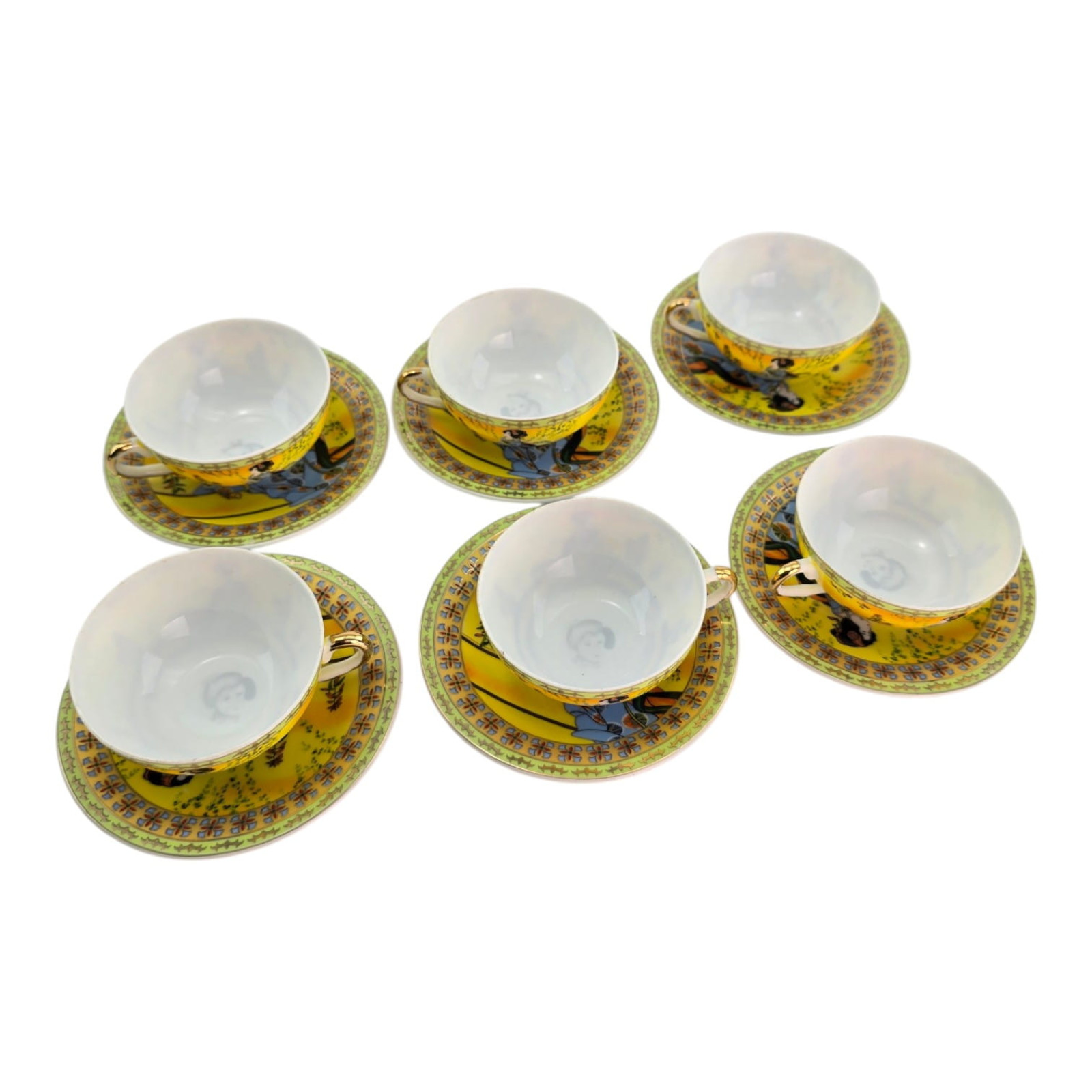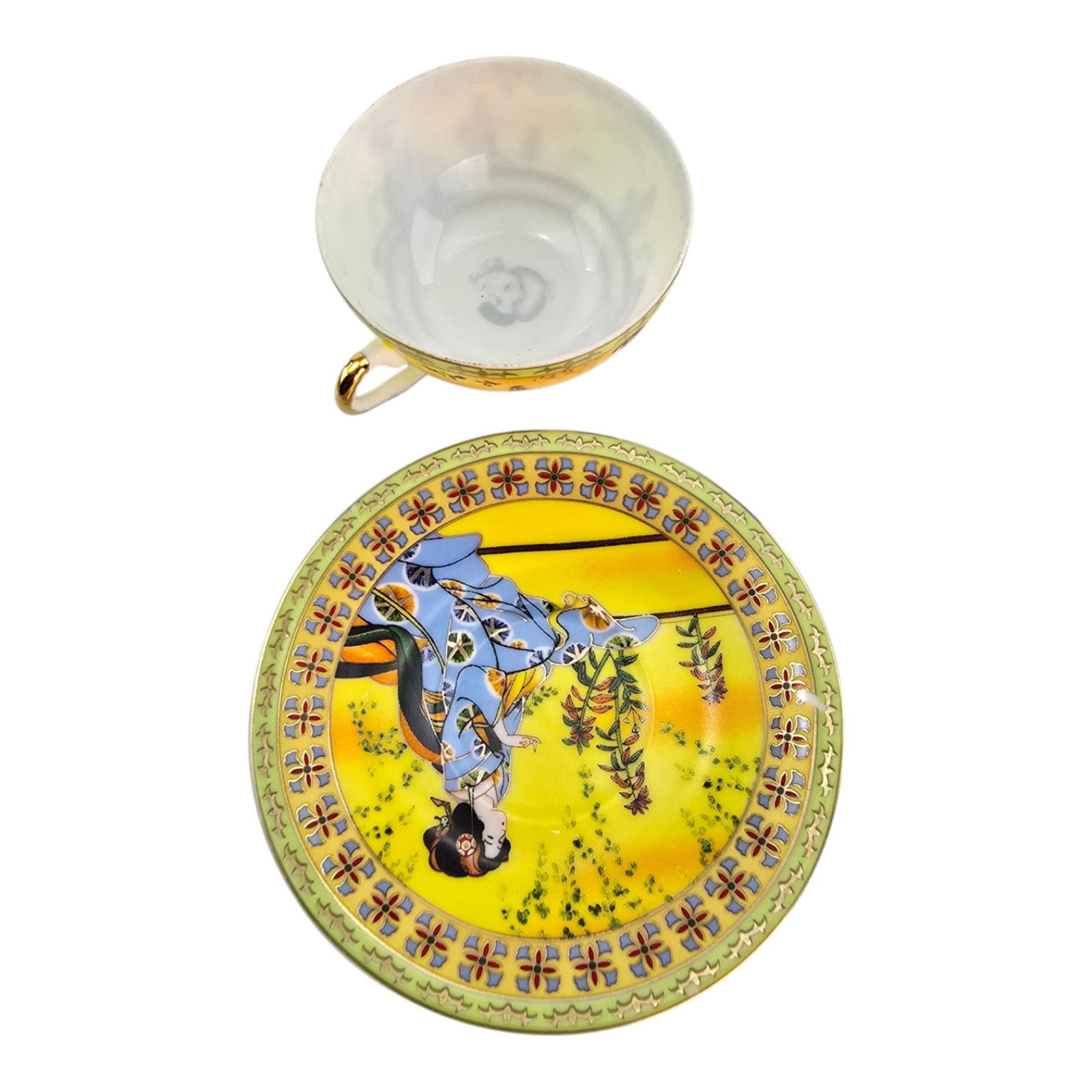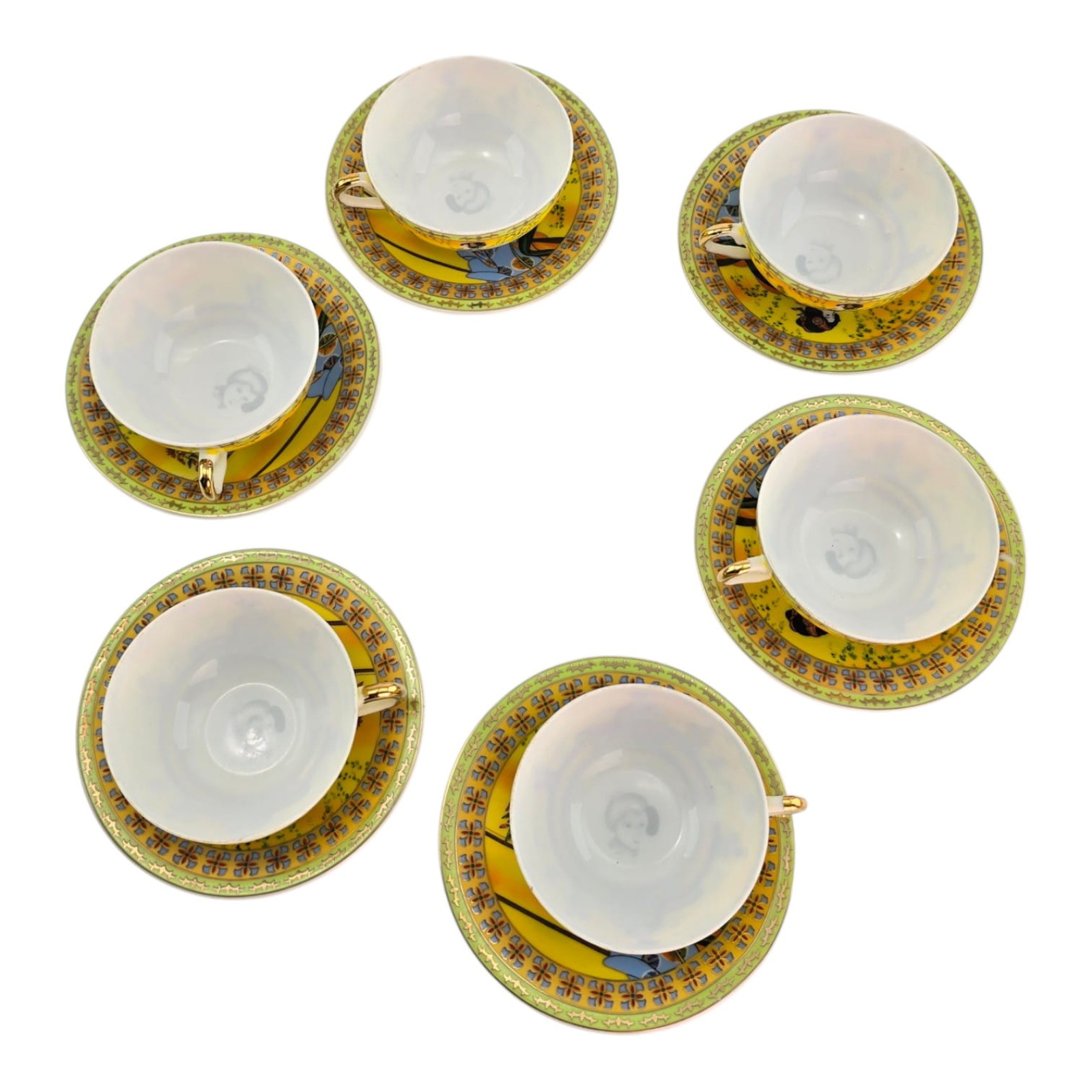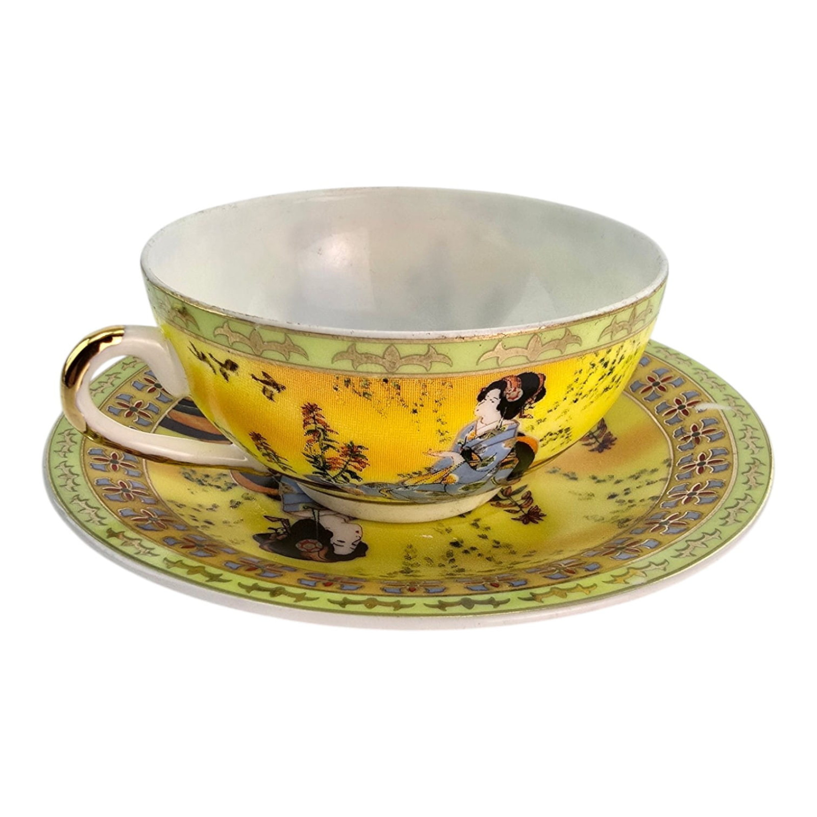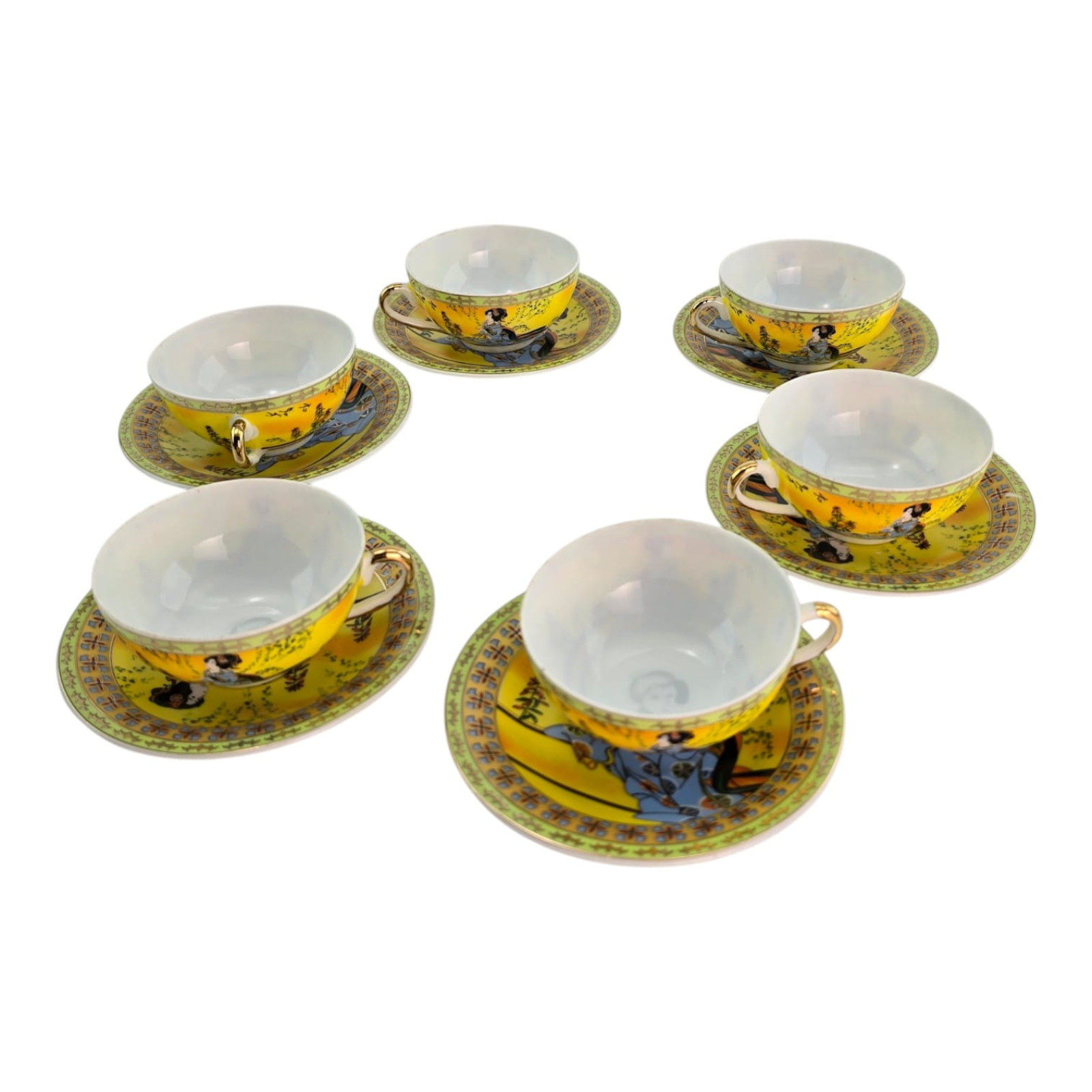 Каждая чашка и блюдце украшены ярким японским декором на солнечном жёлто-золотом фоне: традиционные девушки в кимоно на фоне пагод и пейзажа. Богатый золотой орнамент по краю.