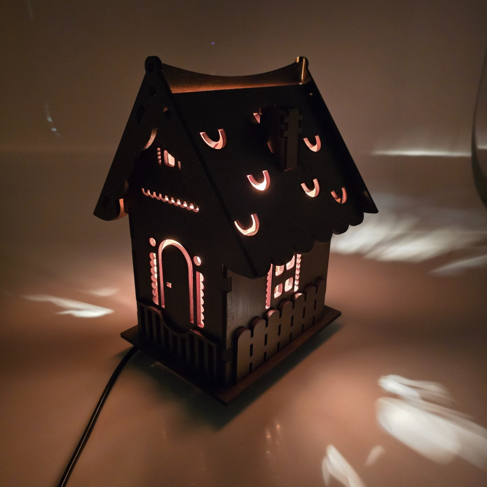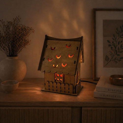 Уютный светильник в форме домика, выполненный из натуральной фанеры и украшенный декоративной подсветкой.