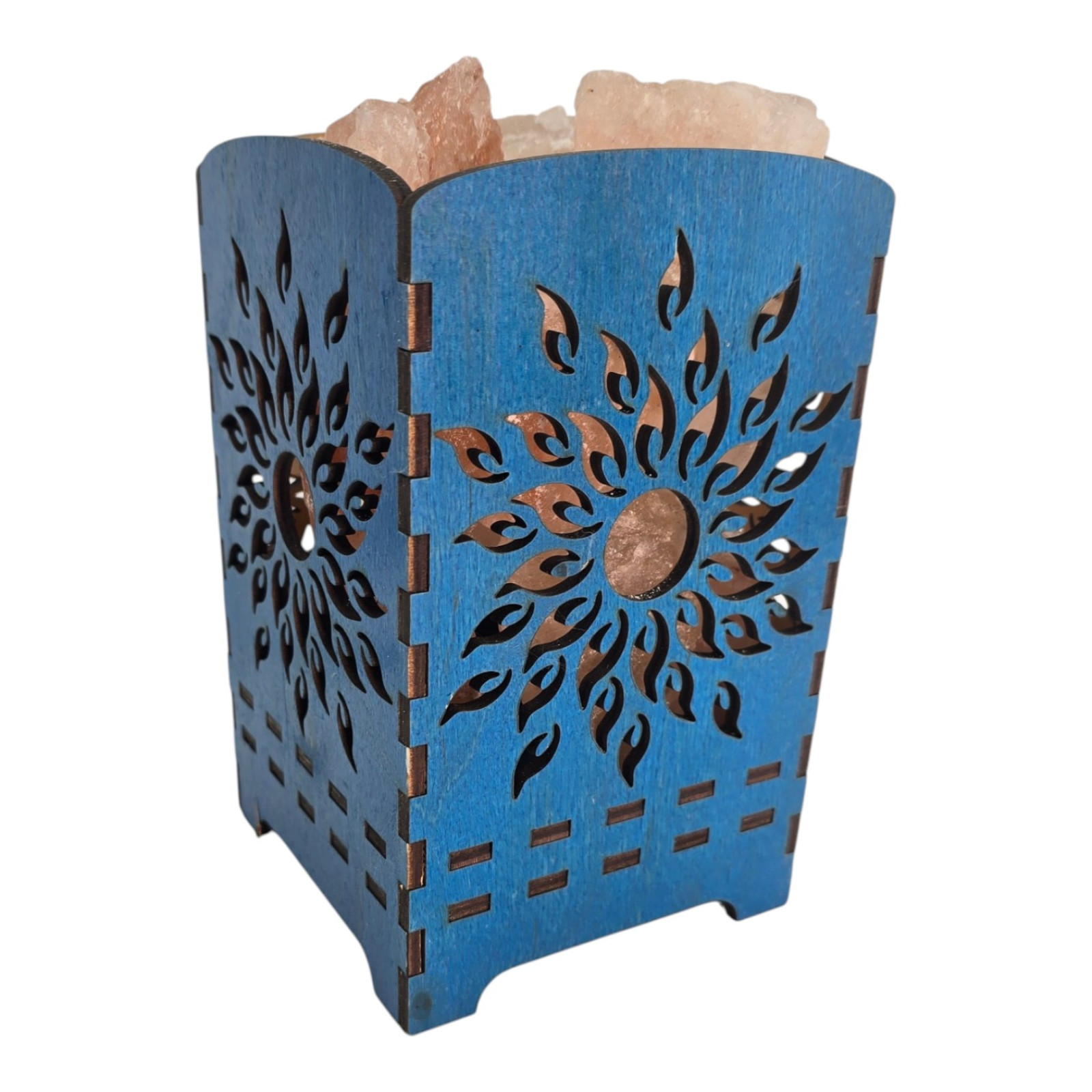 Корпус светильника выполнен из дерева с декоративной резьбой в виде солнечного узора. При включении лампы свет проходит через кристаллы гималайской соли и резной орнамент, создавая красивое сияние и мягкие световые узоры.
