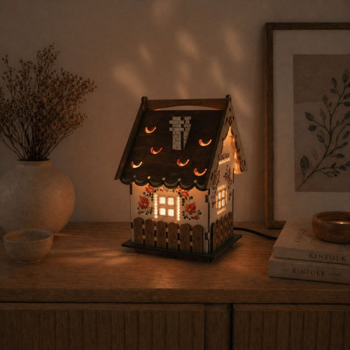 · Дизайн "Домик": Светильник выполнен в виде уютного домика из натурального дерева. Деревянный корпус украшен ажурной резьбой и яркой ручной росписью в народном стиле (цветочные мотивы, заборчик), что придает ему теплоту и сказочный вид. Открывающаяся крыша позволяет любоваться кристаллами соли.