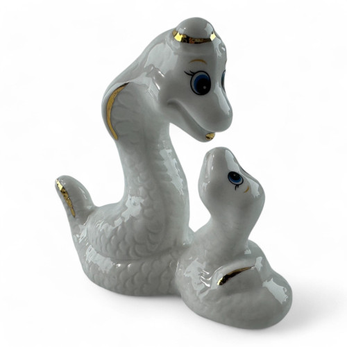 Эта изящная фарфоровая статуэтка изображает двух нежных змей — взрослую и детеныша — в трогательном моменте взаимодействия. Гладкий белый фарфор с нежными золотыми акцентами придает фигурке элегантный и утонченный вид.