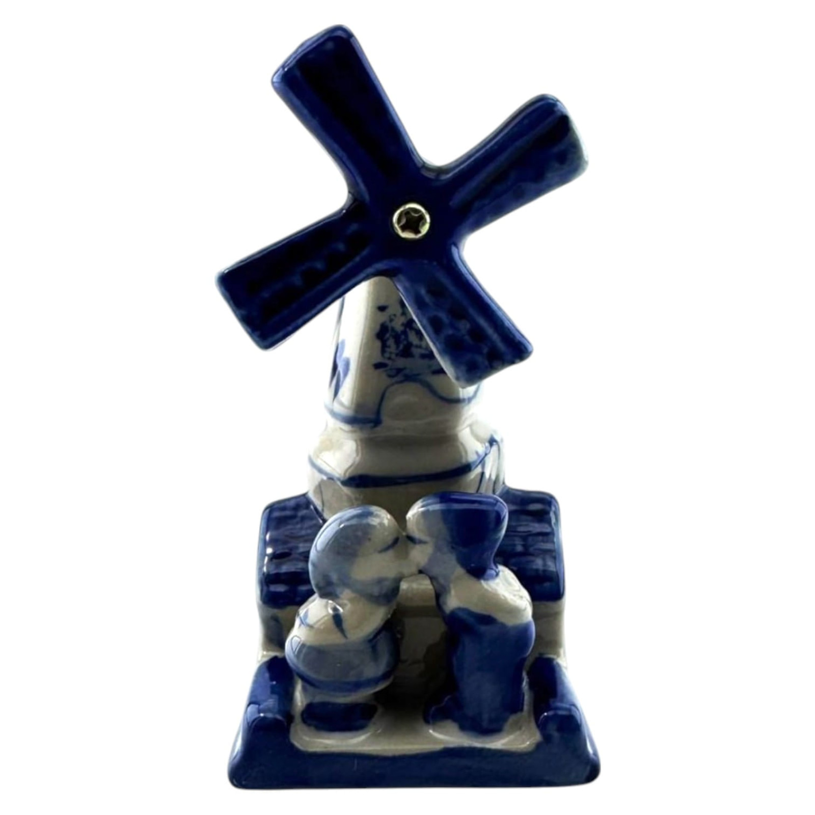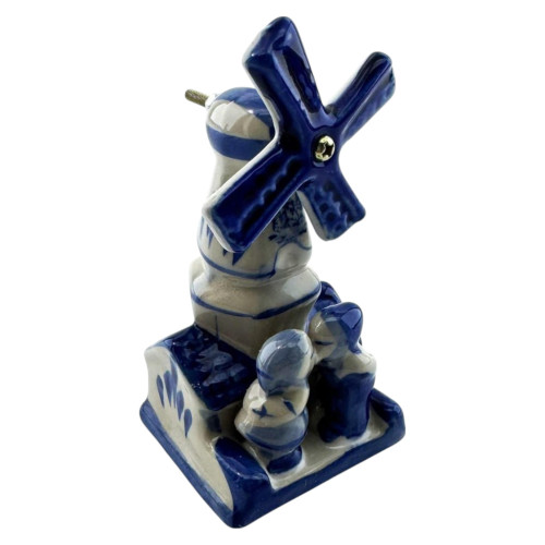 Эта изящная керамическая мельница — настоящий символ уюта и романтики. Выполненная в классической сине-белой гамме, она украшена трогательной сценой с парой в традиционной одежде, создающей атмосферу деревенского спокойствия и тепла. Ветряные лопасти вращаются, придавая композиции живость и динамику.