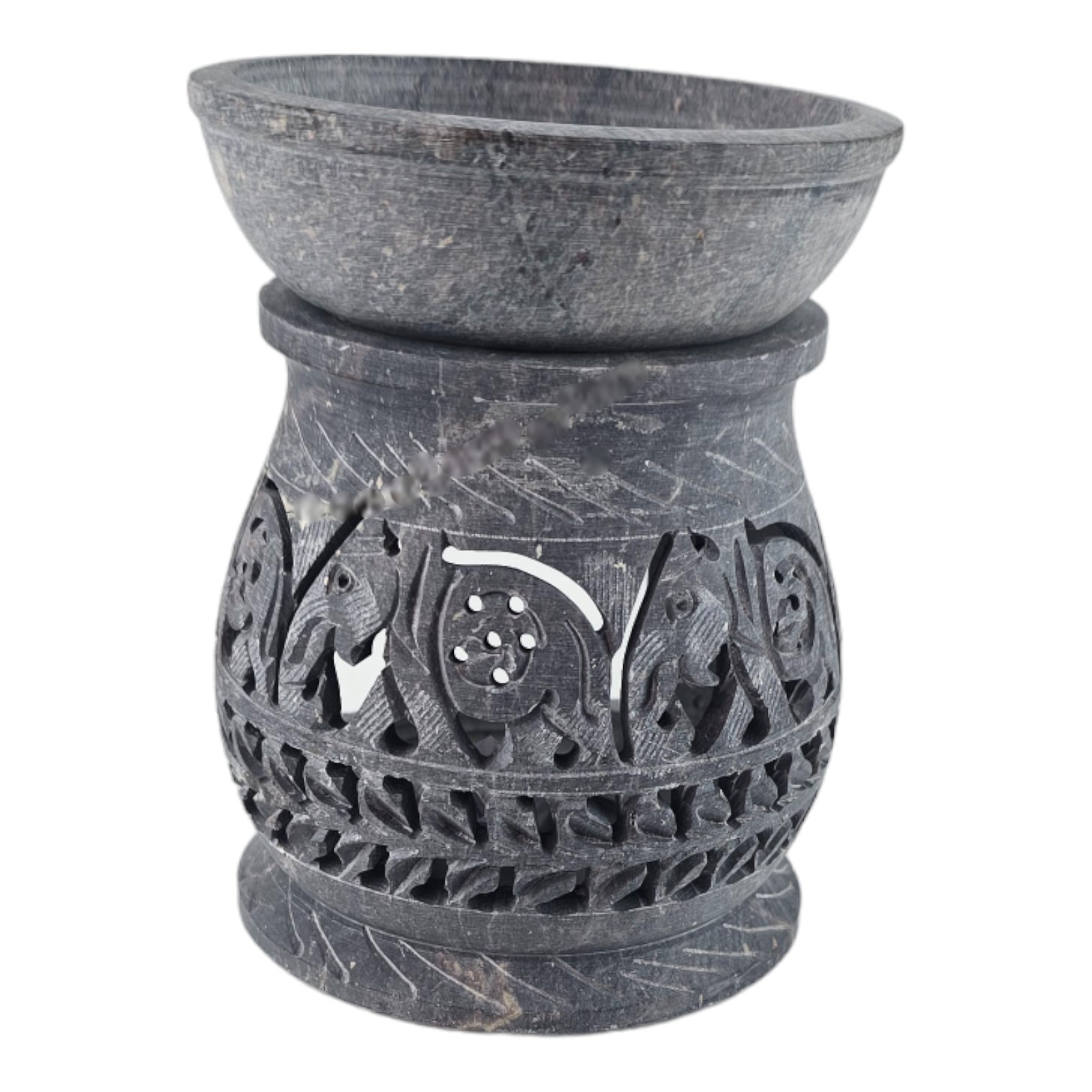 Ця аромалампа є унікальним і вражаючим предметом, який відображає глибокі традиції та символіку Індії. Виготовлена вручну з мильного каменю, вона вражає своєрідністю та елегантністю. Відполірована поверхня надає їй блиску та вишуканості, а зображення слоників, які вирізані на боках, надають їй особливого шарму та душевності.