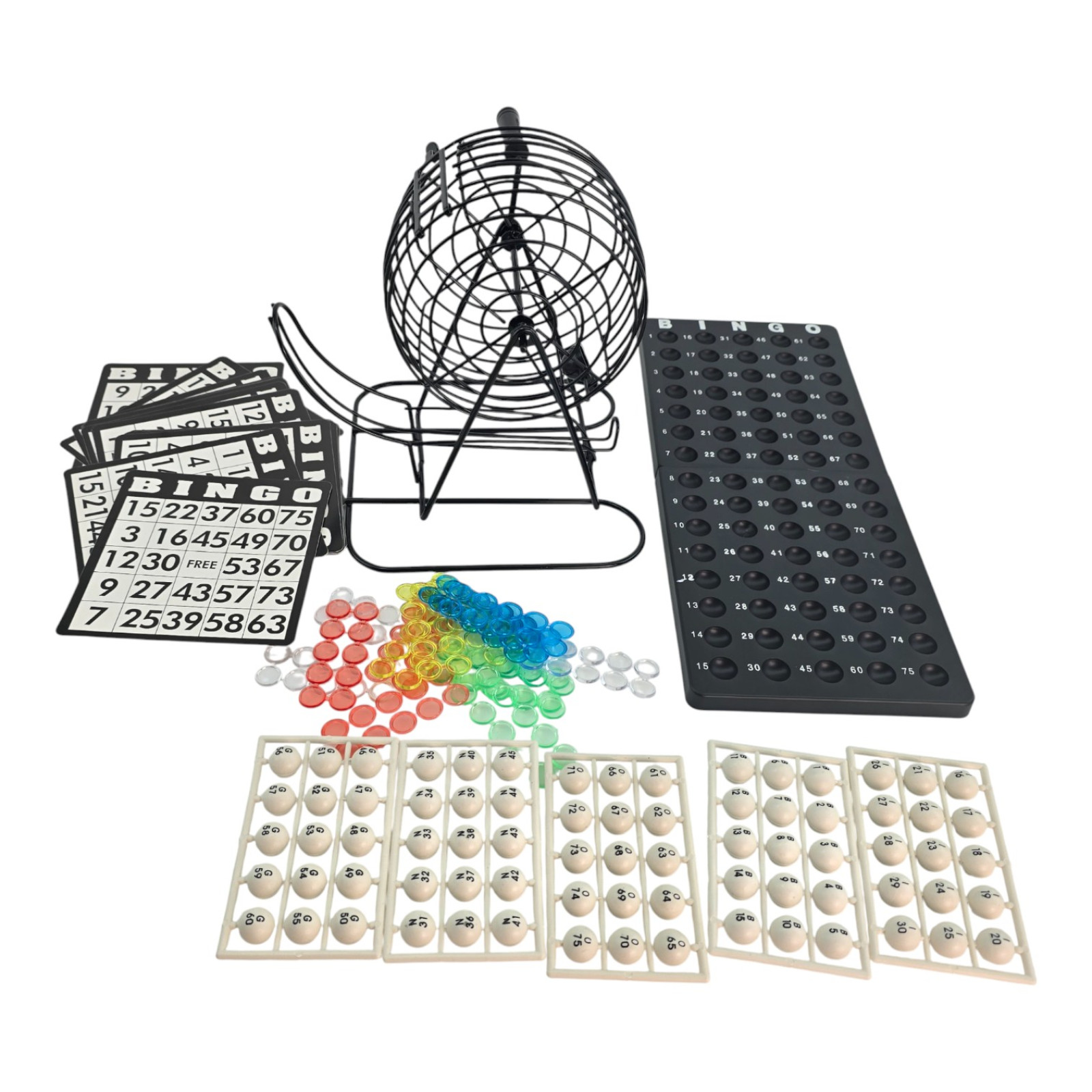 Комплектація: металева клітинка з ручкою, 75 кульок 1–75, дошка-реєстр Master Board, 18 карток, близько 150 фішок-маркерів, інструкція