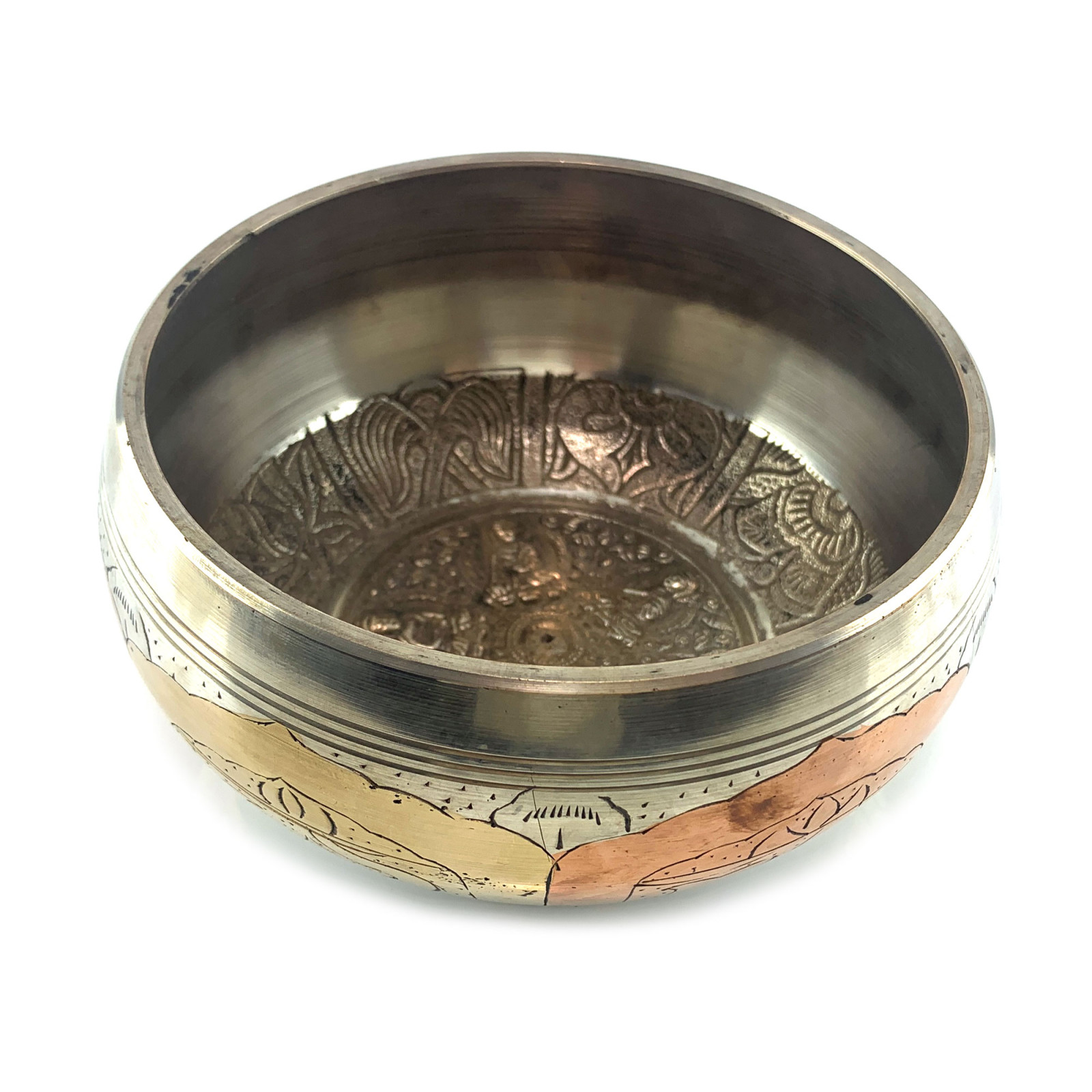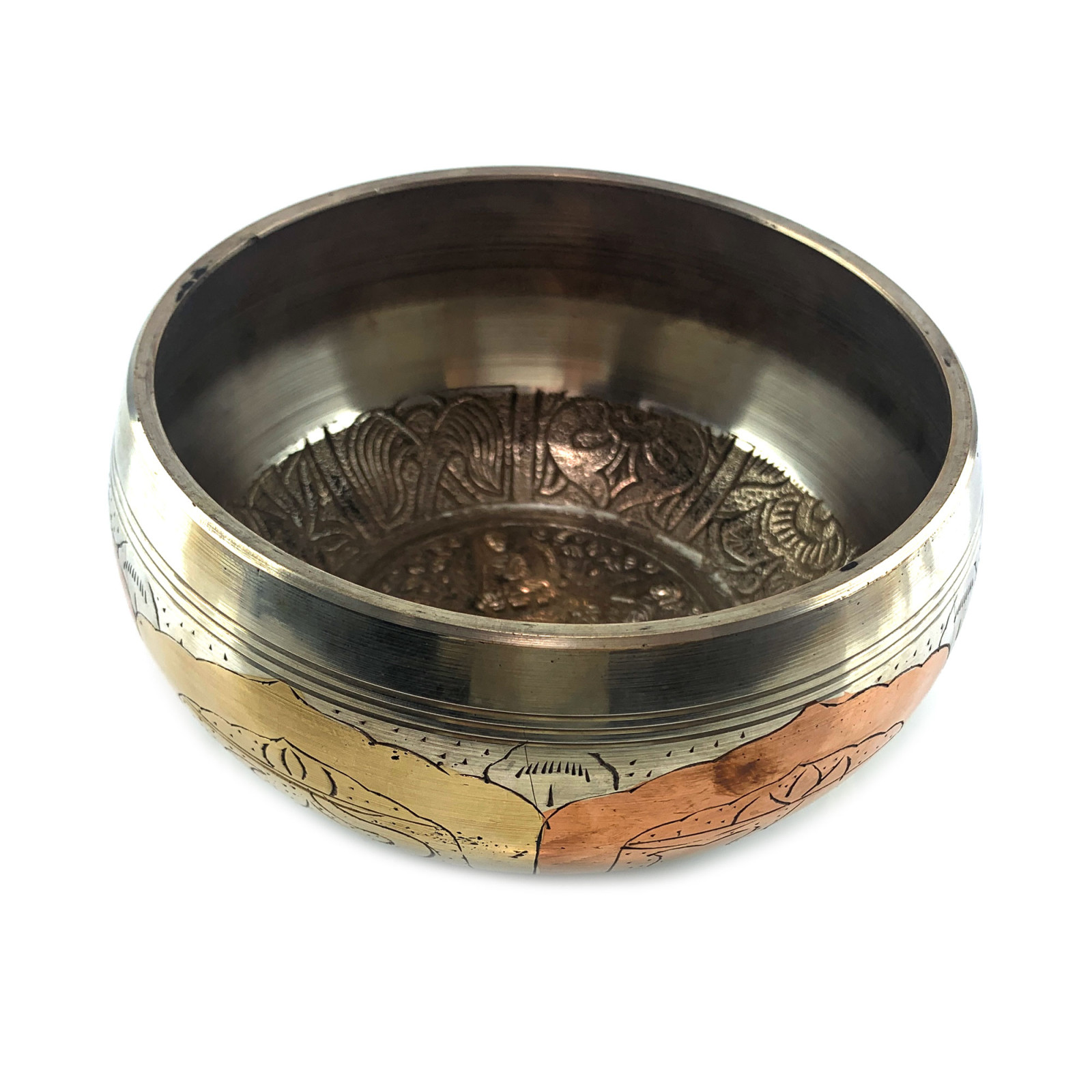 Представляємо унікальну бронзову чашу, що співає. Ця чаша - справжній витвір мистецтва, створений з особливою увагою до деталей і прикрашений золотистими та мідними вставками зовні, що надає їй розкішного вигляду.
