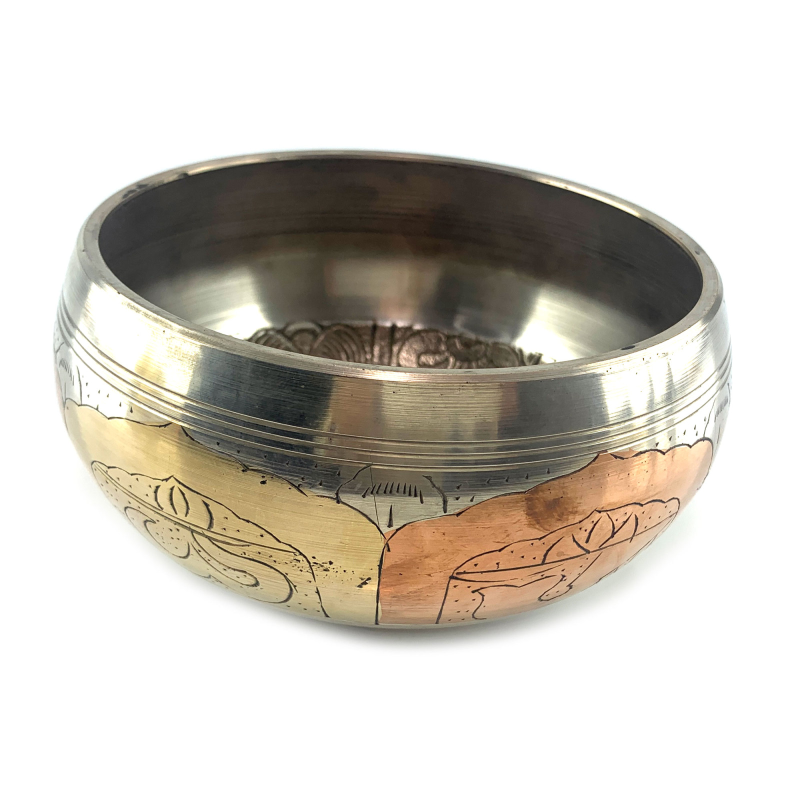Чаша виготовлена з бронзи, яка вкрита сріблястим кольором. Золотисті та мідні вставки назовні додають їй витонченості та розкоші. Усередині чаші зображено 5 Будд, що символізують мудрість, просвітлення та внутрішній спокій.