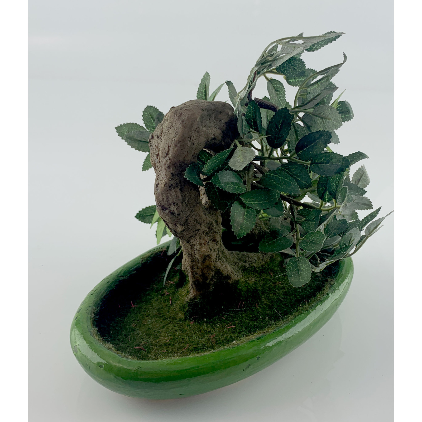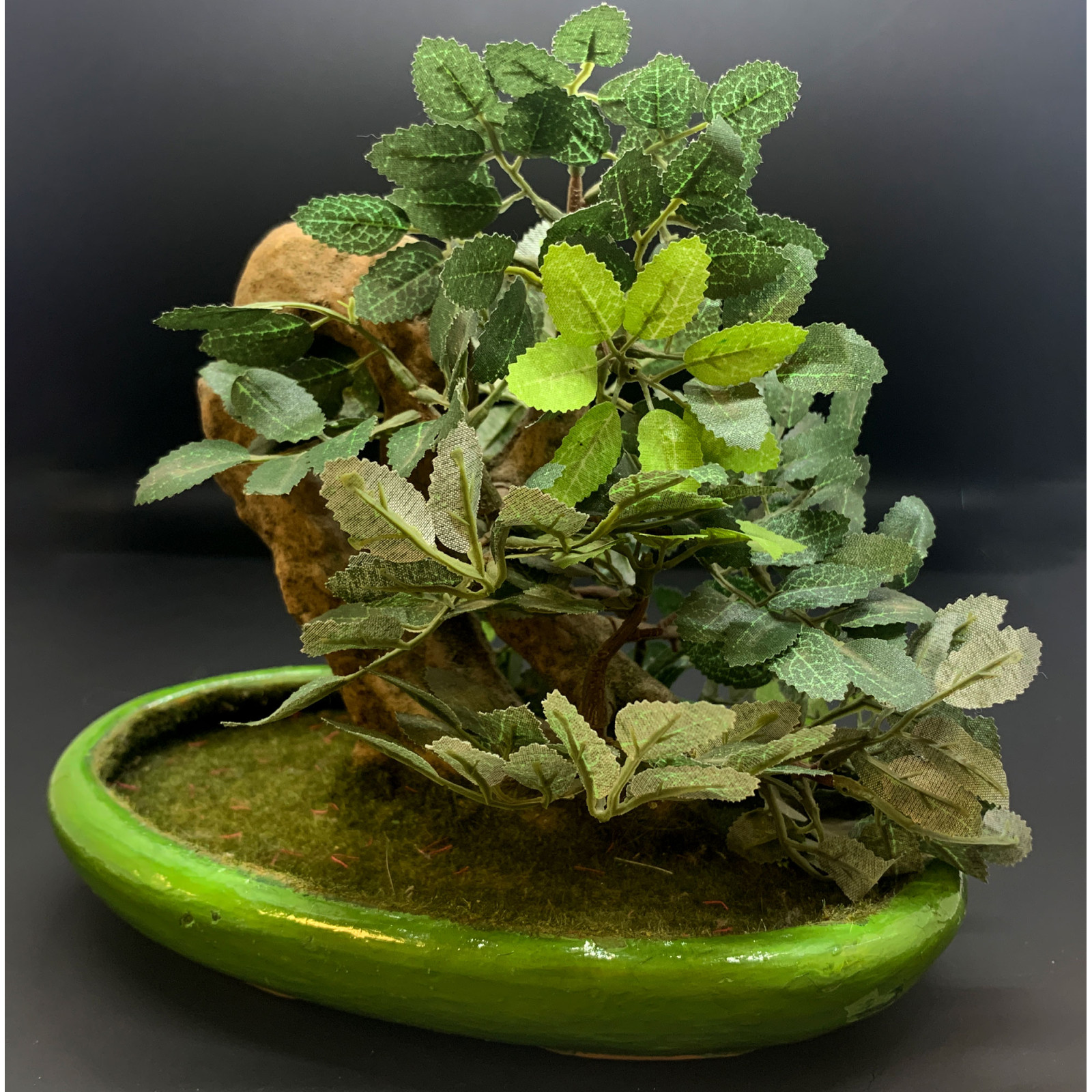 Дерево Бонсай встановлене на зеленій підставці розміром 200х120 мм, що надає йому елегантного та стильного вигляду. Це прекрасне дерево з гілками та листям висотою 200 мм створює відчуття природної гармонії та спокою.