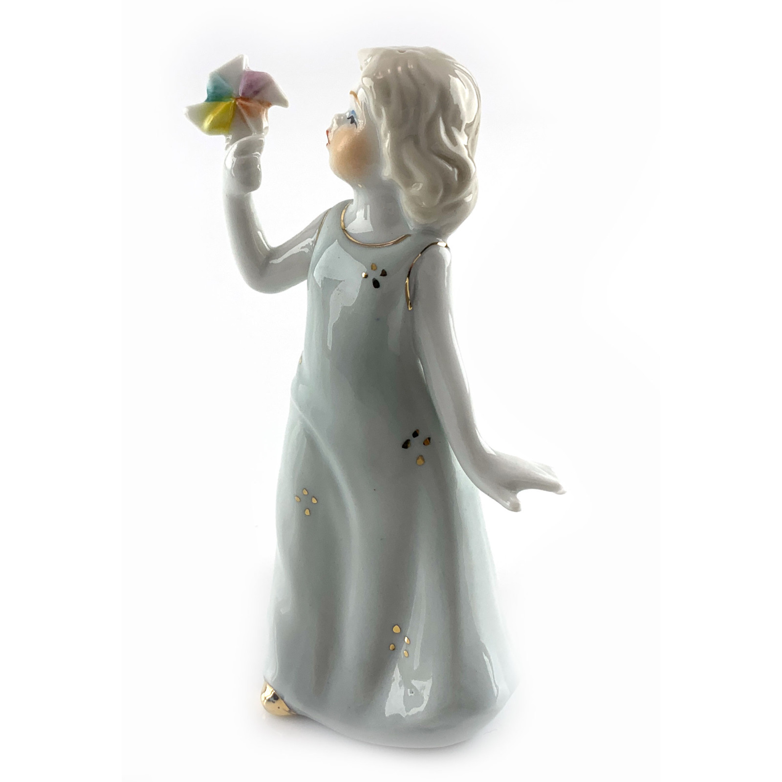 Ця вишукана статуетка переносить вас у світ мрій та ніжності. Дівчина в ніжній білій сукні з золотистим черевичком і вітряком у руці випромінює елегантність та шарм.