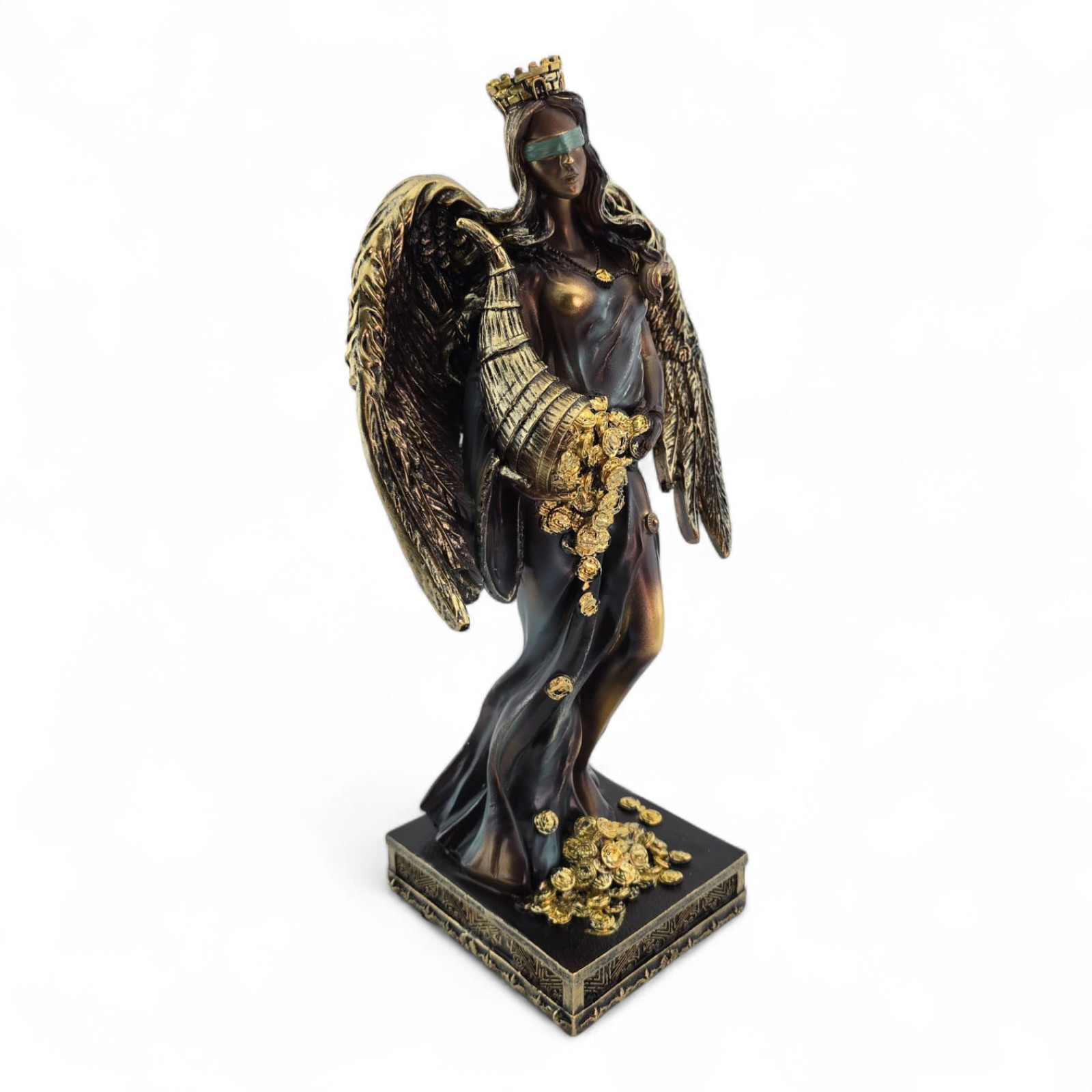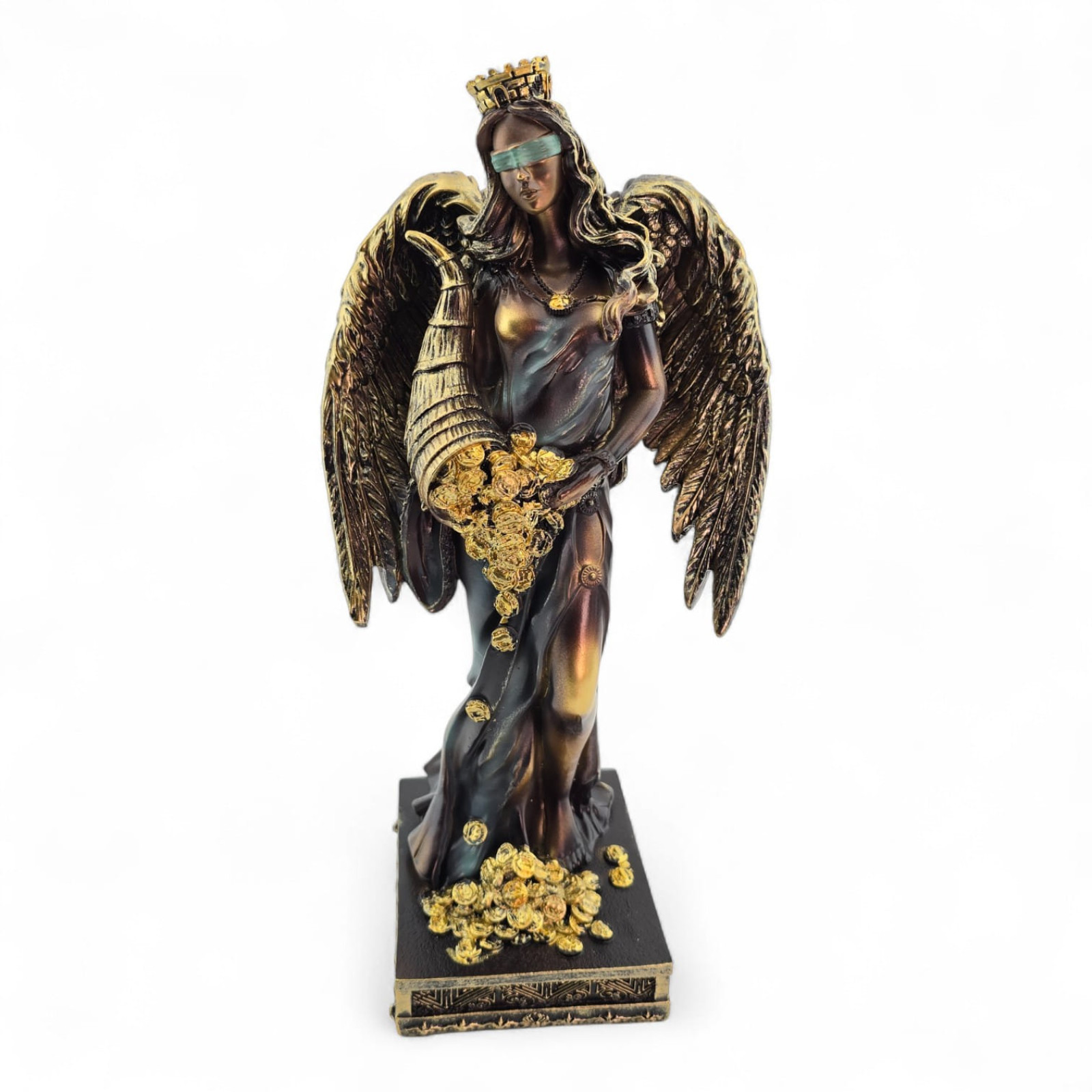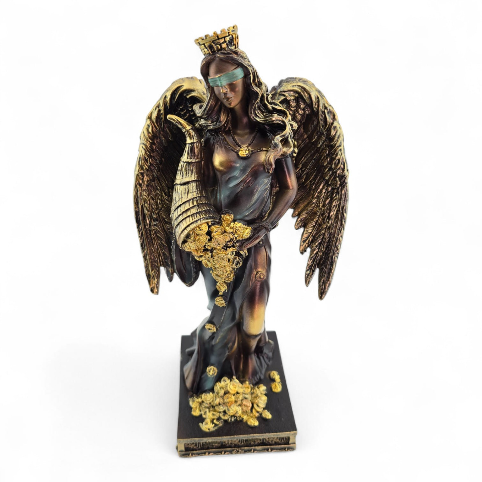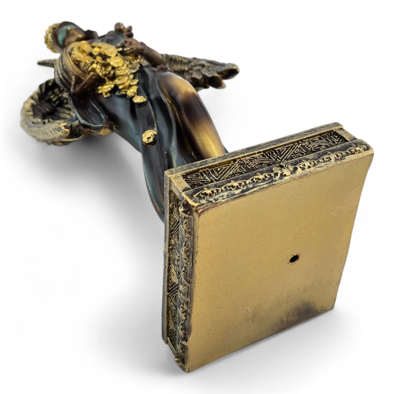 Виразна настільна статуетка у бронзовому стилі із золотистими монетами. Незвичайний образ Фортуни з крилами та рогом достатку символізує удачу та достаток. Ретельно опрацьовані крила та корона, стійка декоративна підставка. Підійде для дому та офісу, а також як подарунок на відкриття бізнесу та свята.
