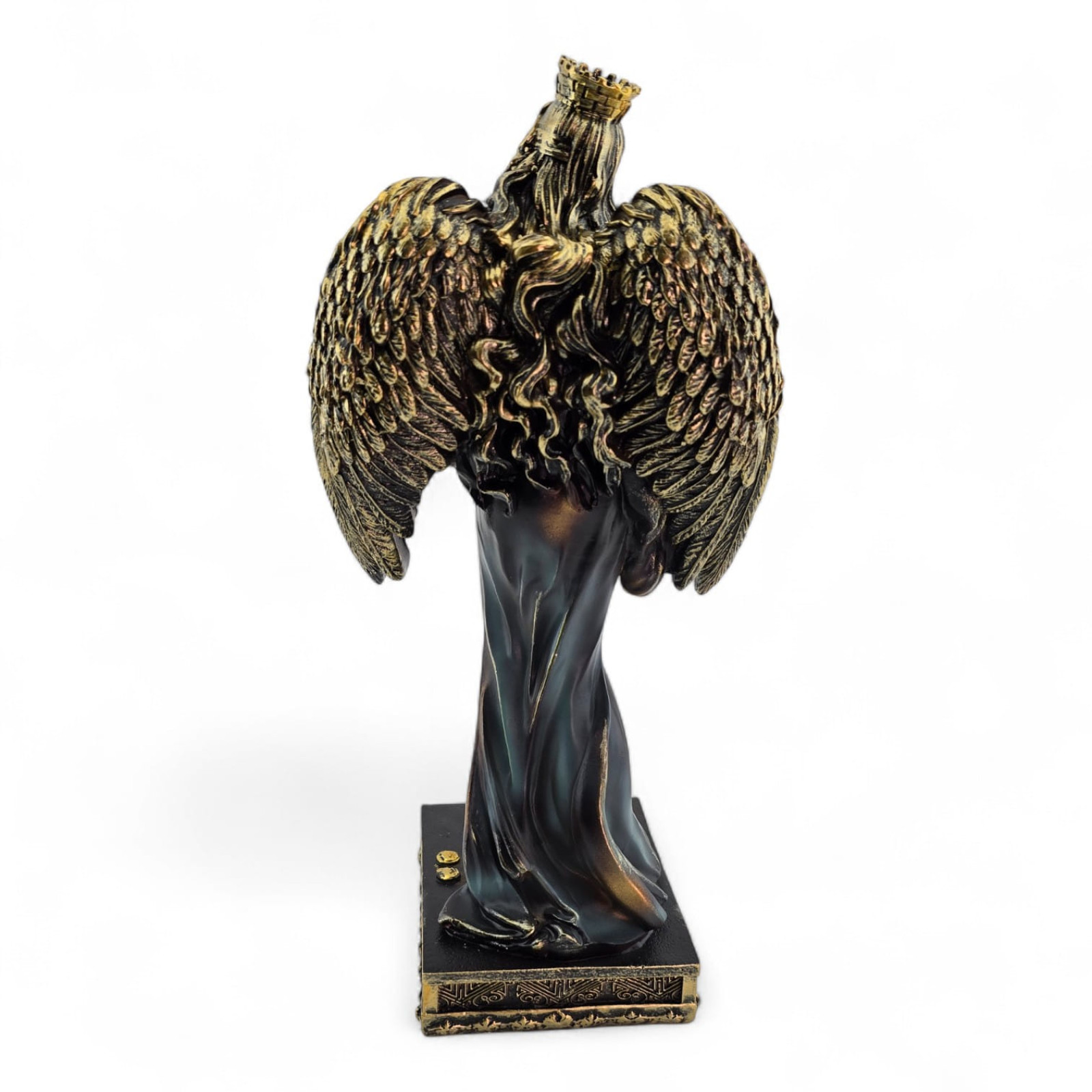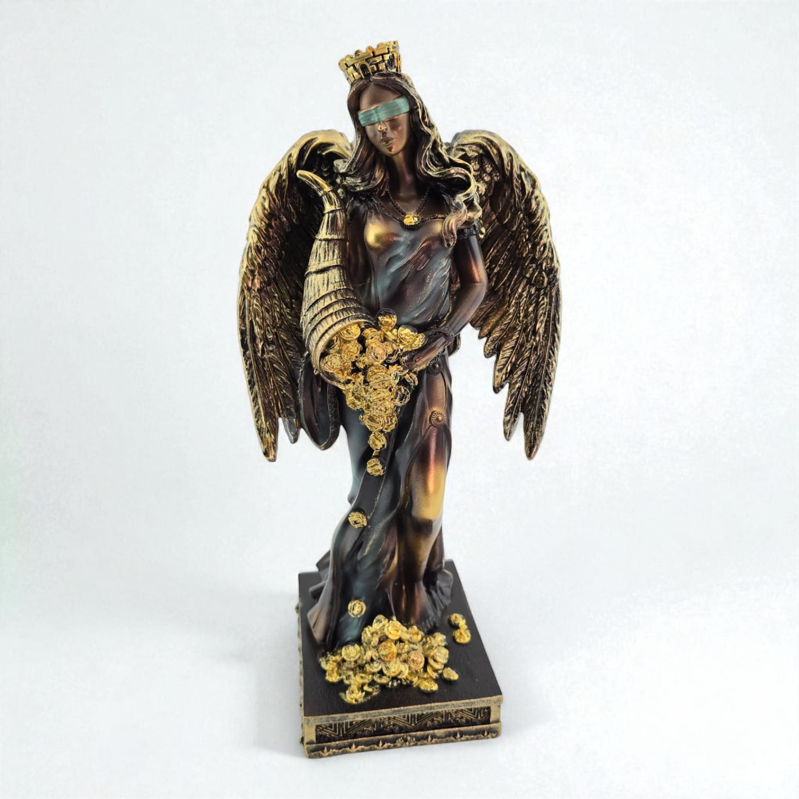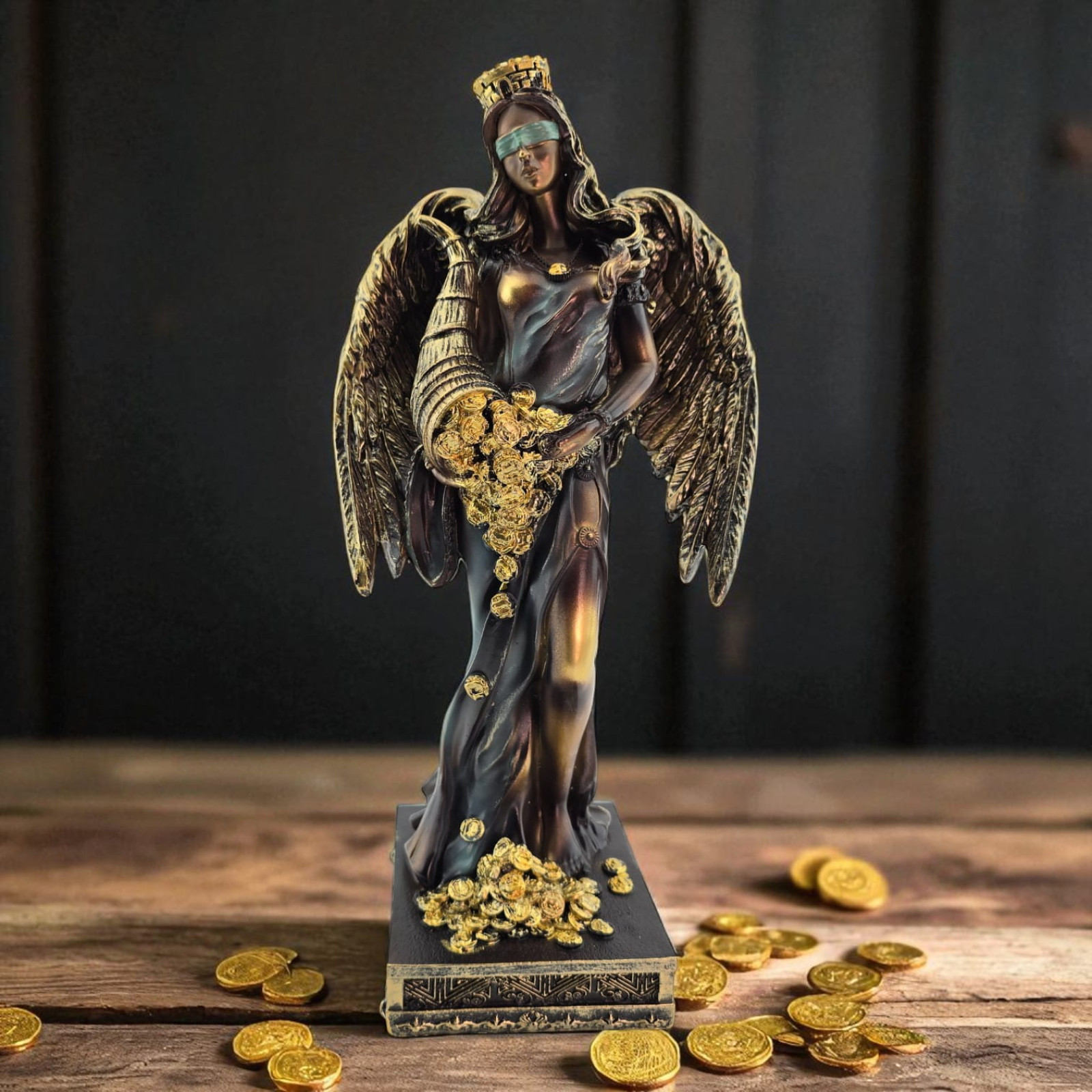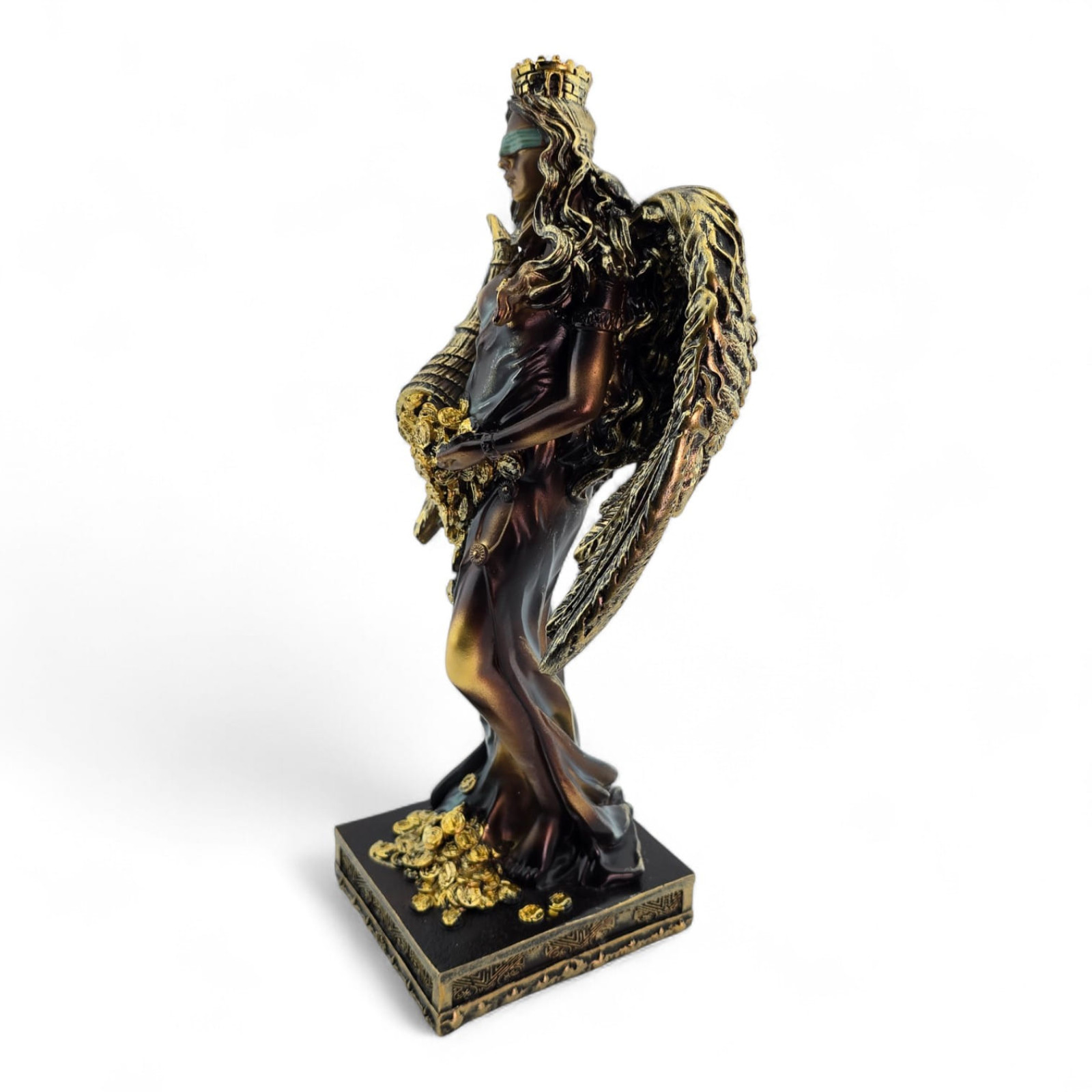 Виразна настільна статуетка у бронзовому стилі із золотистими монетами. Незвичайний образ Фортуни з крилами та рогом достатку символізує удачу та достаток. Ретельно опрацьовані крила та корона, стійка декоративна підставка. Підійде для дому та офісу, а також як подарунок на відкриття бізнесу та свята.
