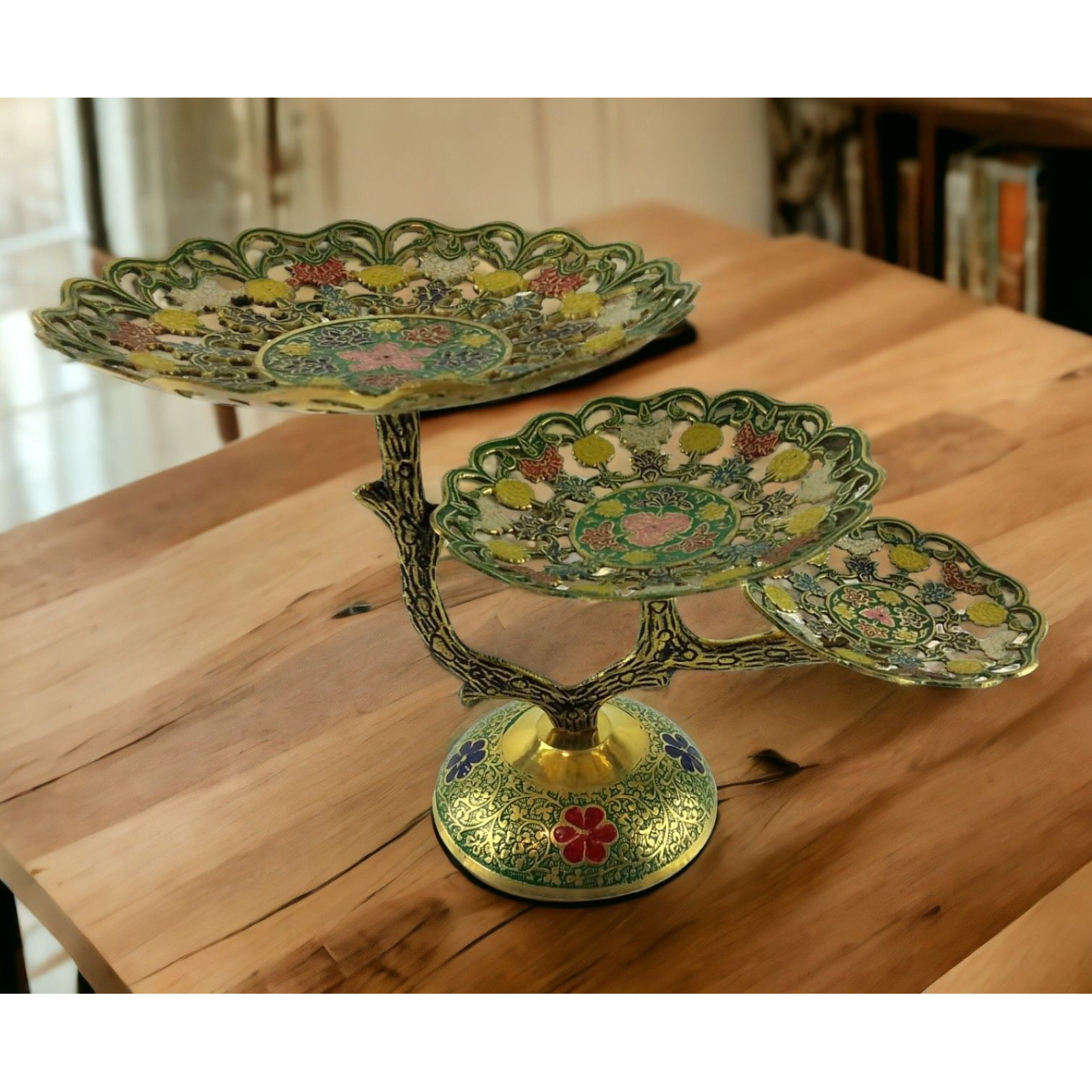 Опис Фруктівниця бронзова 3 х ярусна, різьблена зелена (24х38х22,5 см)