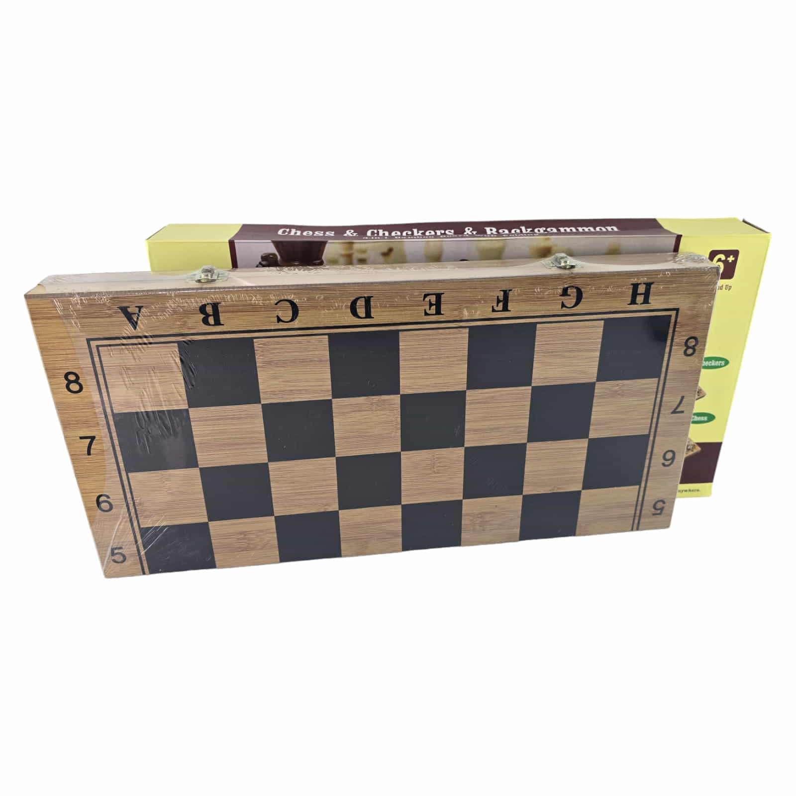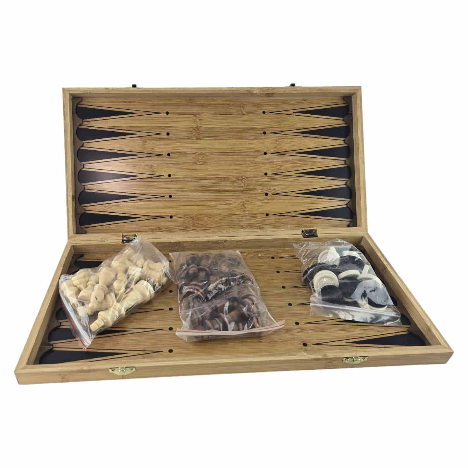 Представляємо вам ігровий набір, який включає шахи, нарди та шашки – ідеальний варіант для гри та розваг у будь-якому місці. Цей набір виготовлений переважно з природних матеріалів: дошка виготовлена з бамбука, шахові фігури - з дерева, а фішки та кубики - з пластику.
