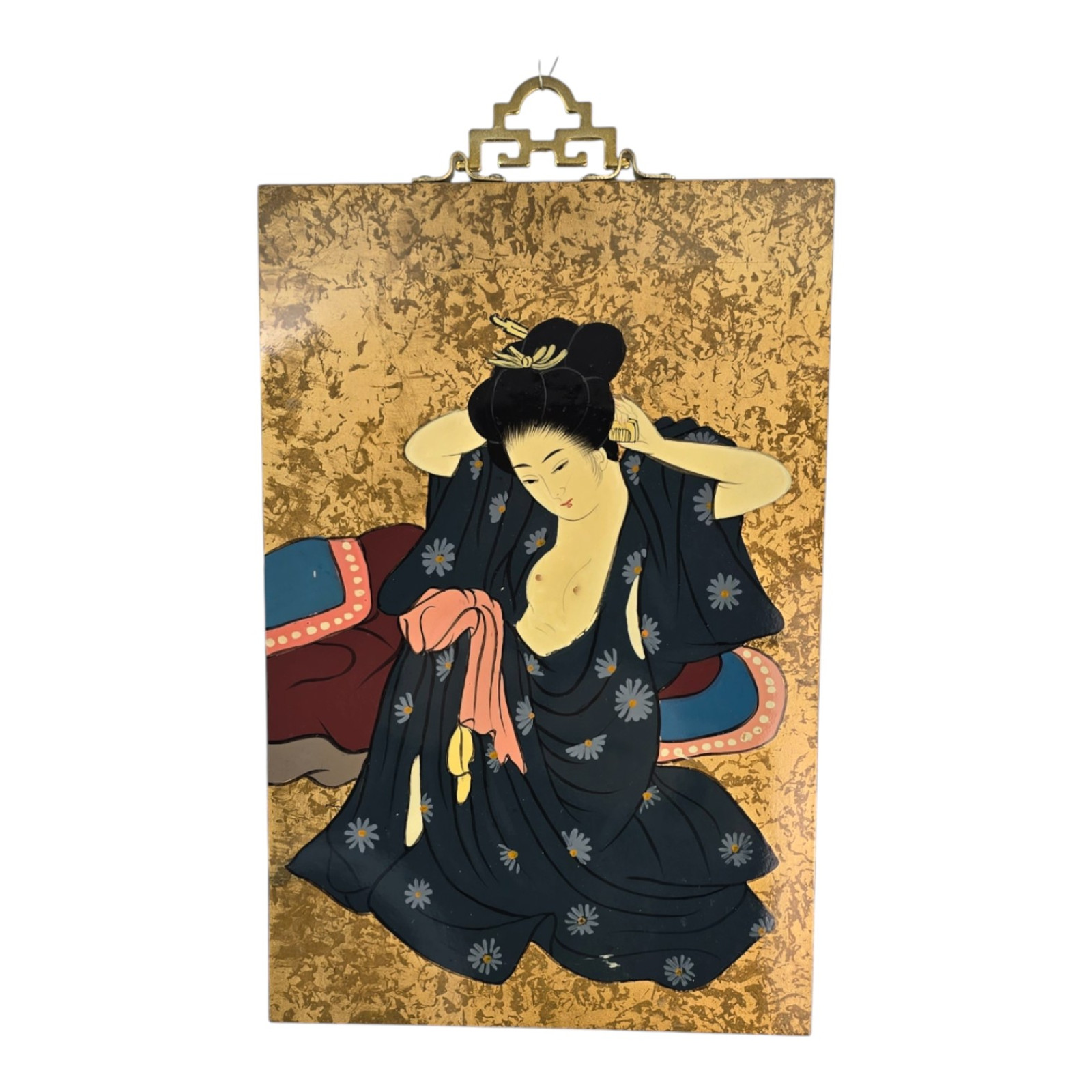 Настінне панно з образом японської гейші на золотистому фоні створює відчуття східного будуару з легким інтимним настроєм. Детальне зображення дівчини у темному кімоно з квітами добре видно навіть здалеку та ефектно виглядає при штучному освітленні.