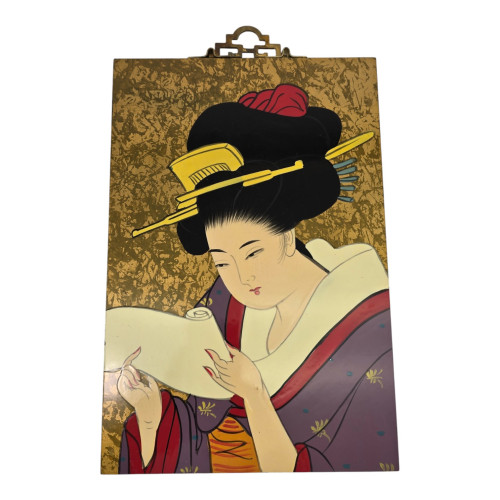 Настінне панно із зображенням японки, що читає сувій, стане виразним акцентом у східному чи еклектичному інтер'єрі. Тепле золотисте тло і яскраве кімоно добре поєднуються з дерев'яною основою і нагадують традиційну японську гравюру.