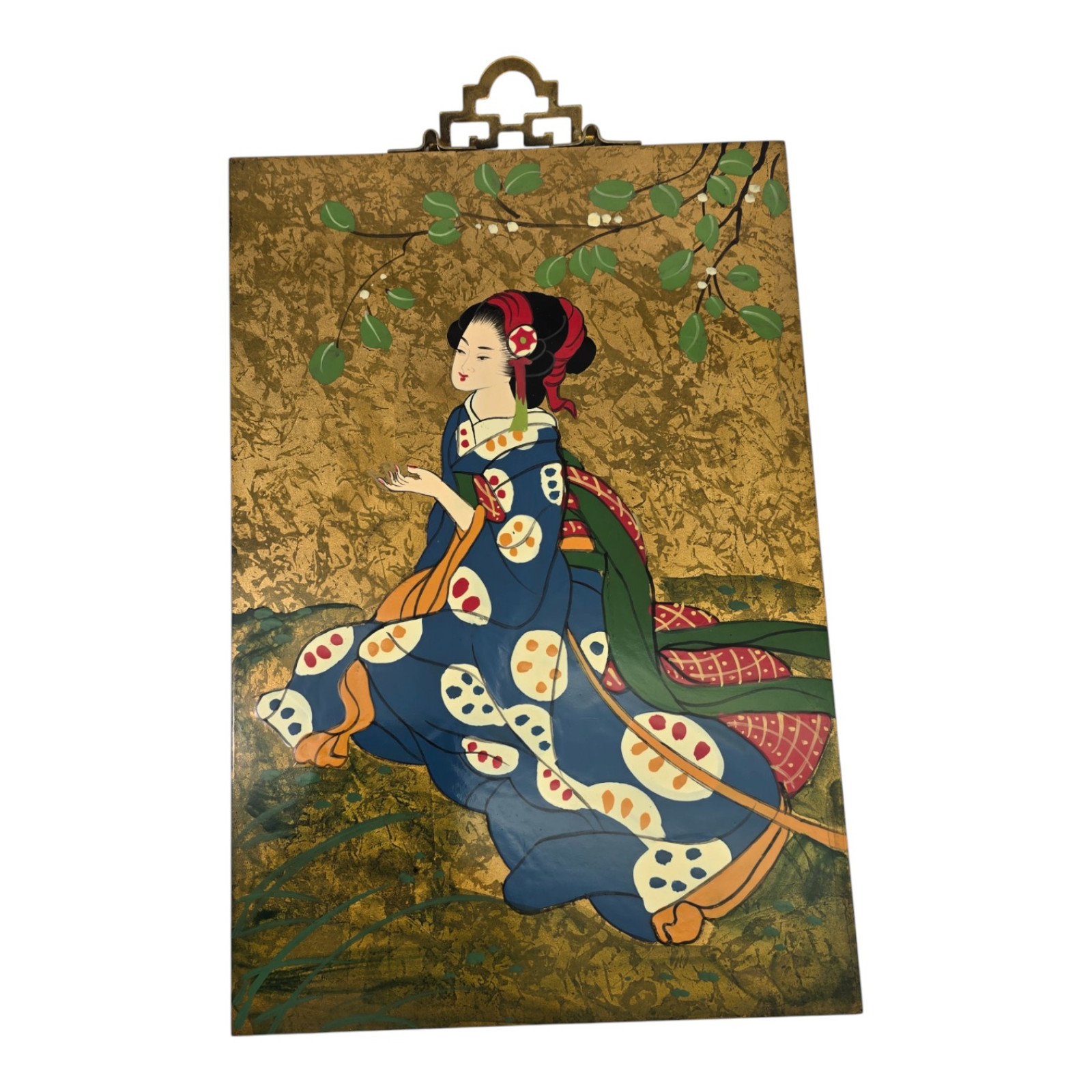 Настінне панно у східному стилі із зображенням гейші, що сидить у саду під гілками дерева. Фон під золото, насичені кольори кімоно та м'які лінії малюнка створюють відчуття спокою та затишку.