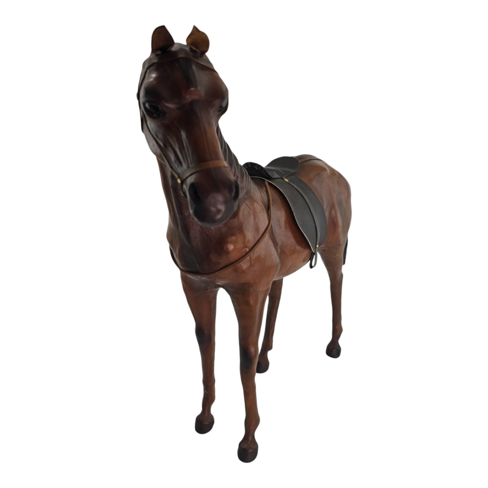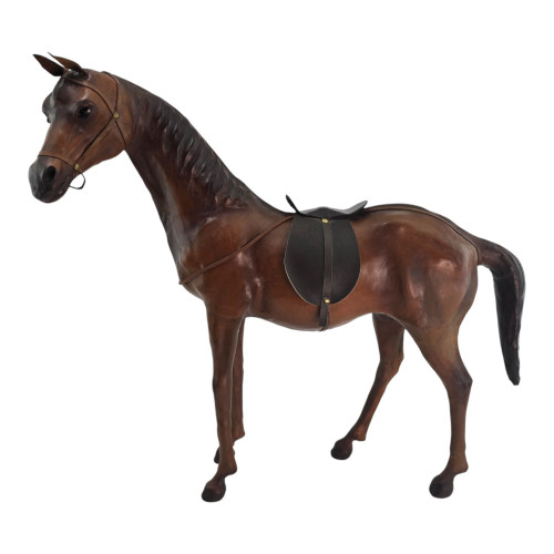 Об'ємна фігурка коня з натуральної шкіри стане помітним акцентом у будинку чи офісі. Стрункий коричневий кінь із сідлом та лаконічною вуздечкою добре передає форму тіла та відчуття руху, тому фігурка виглядає живою та динамічною.