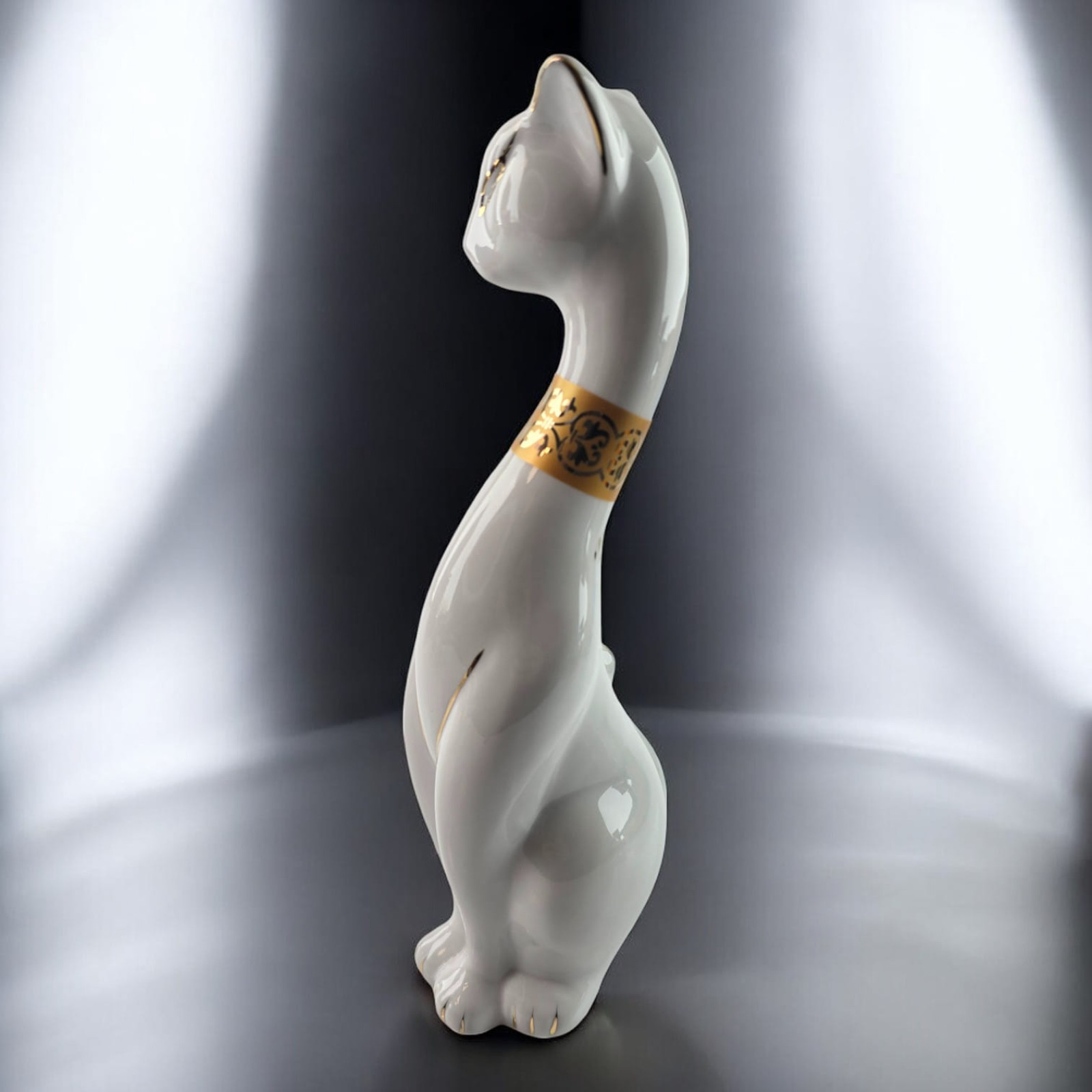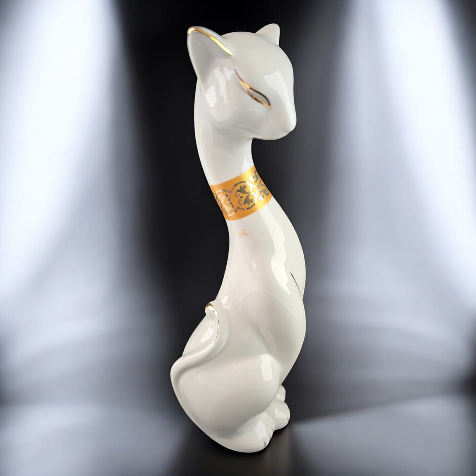 Зустрічайте елегантну фігурку білої кішки, яка додасть світла та витонченості вашому інтер'єру! Зі своєю ніжною красою та позолоченим орнаментом на шиї, ця кішка втілює чистоту, гармонію та грацію.