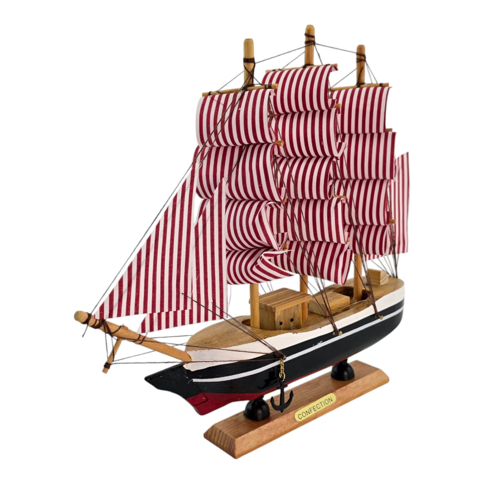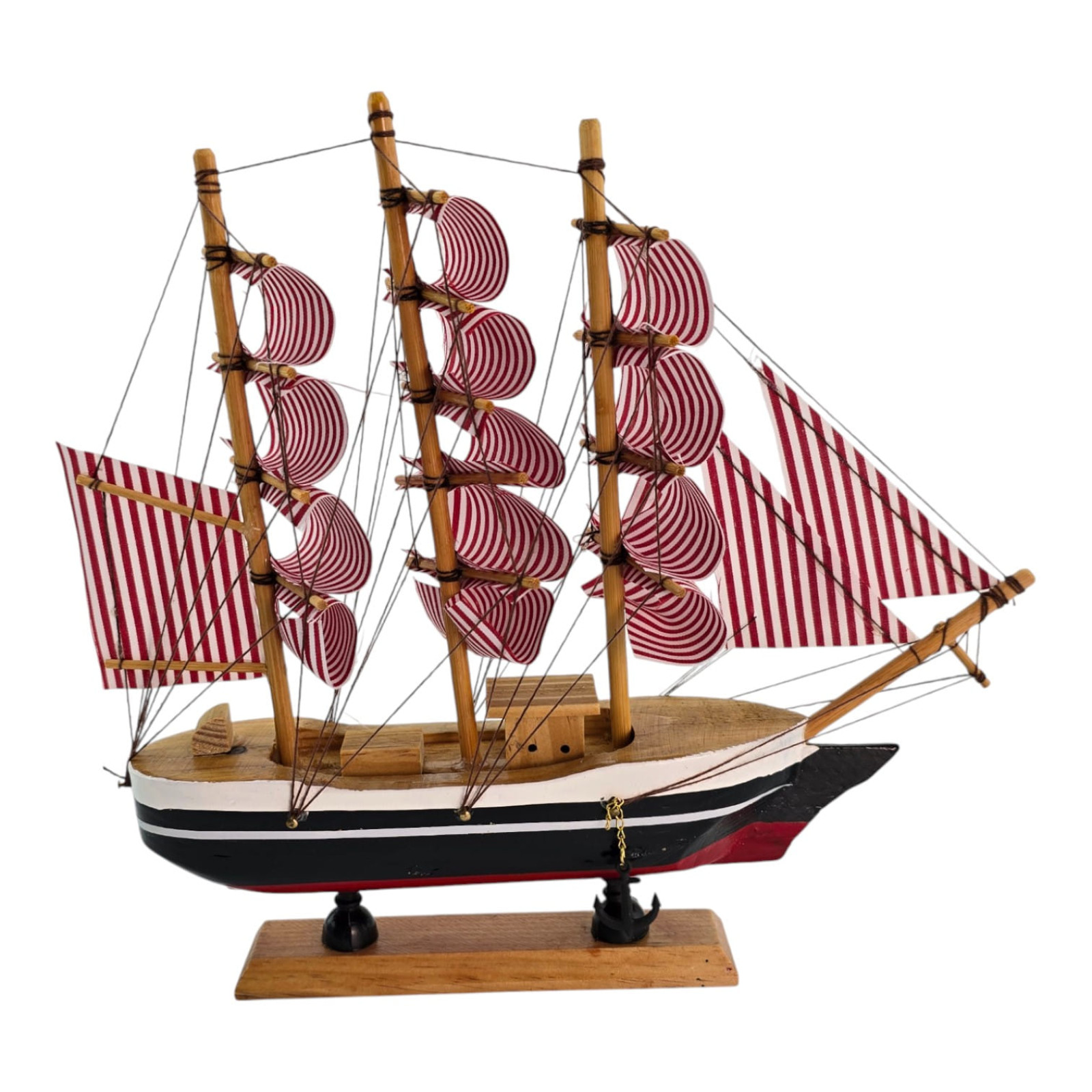 Настільна модель парусного корабля у червоно-білій гамі. Дерев'яний корпус та щогли, тканинні вітрила та шнуровий такелаж створюють виразний морський акцент для полиці, каміна чи робочого столу. Відмінний подарунок любителям морської тематики та стильний елемент інтер'єру.