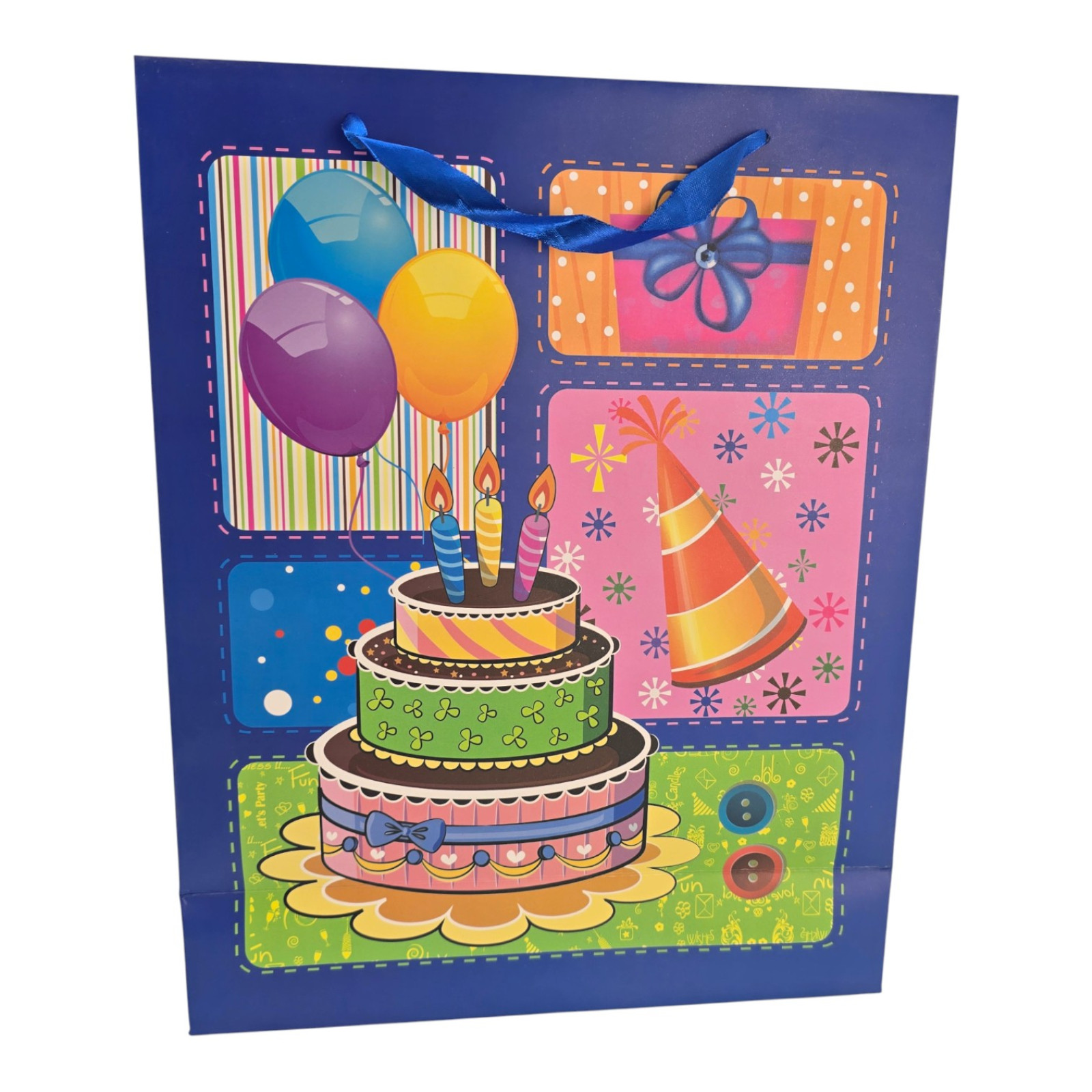 Яскраві синій подарунковий пакет для дня народження. На передній стороні зображені повітряні кулі, святковий торт зі свічками, ковпак та подарунок у декоративних рамках. Об'ємне зображення торта робить дизайн більш живим та святковим.