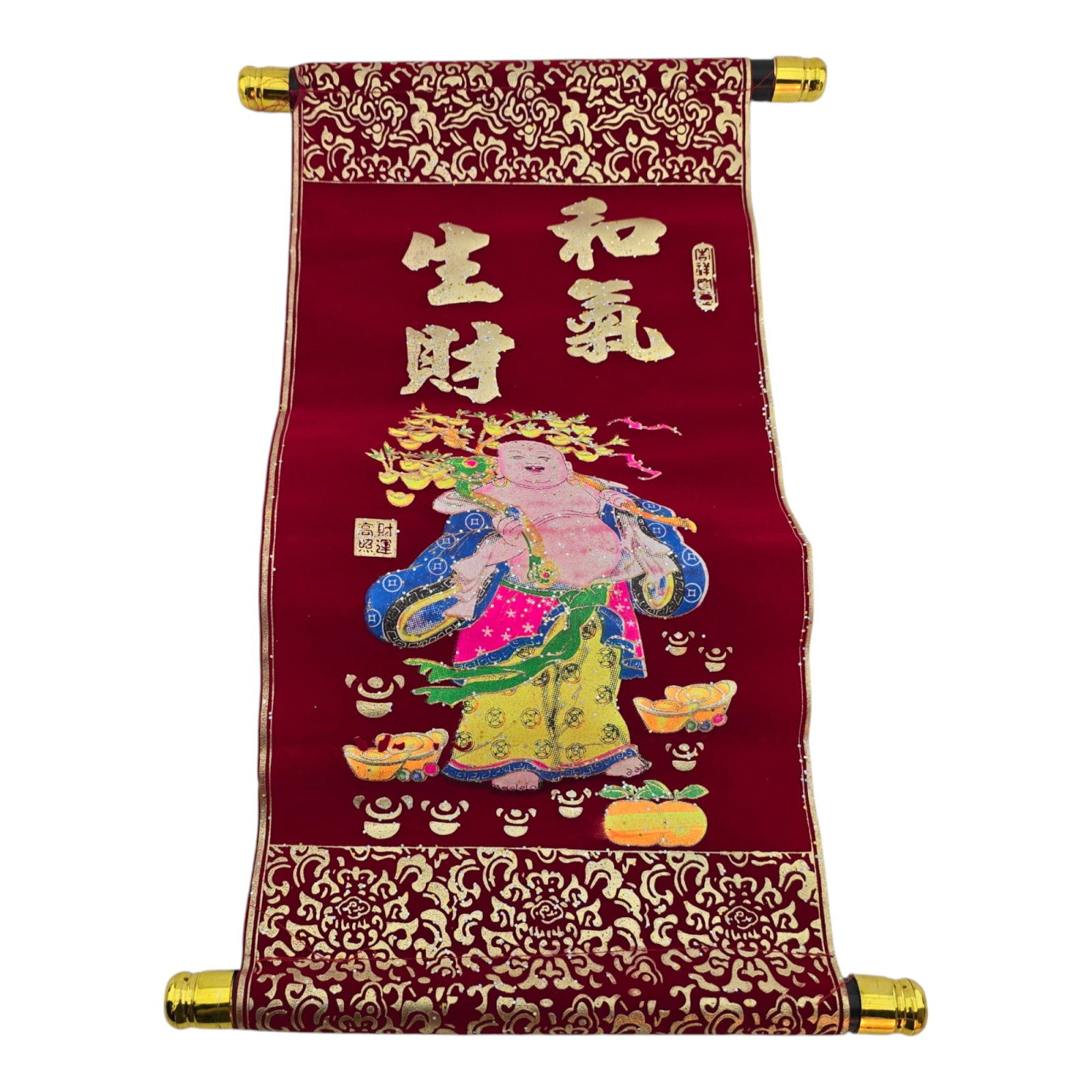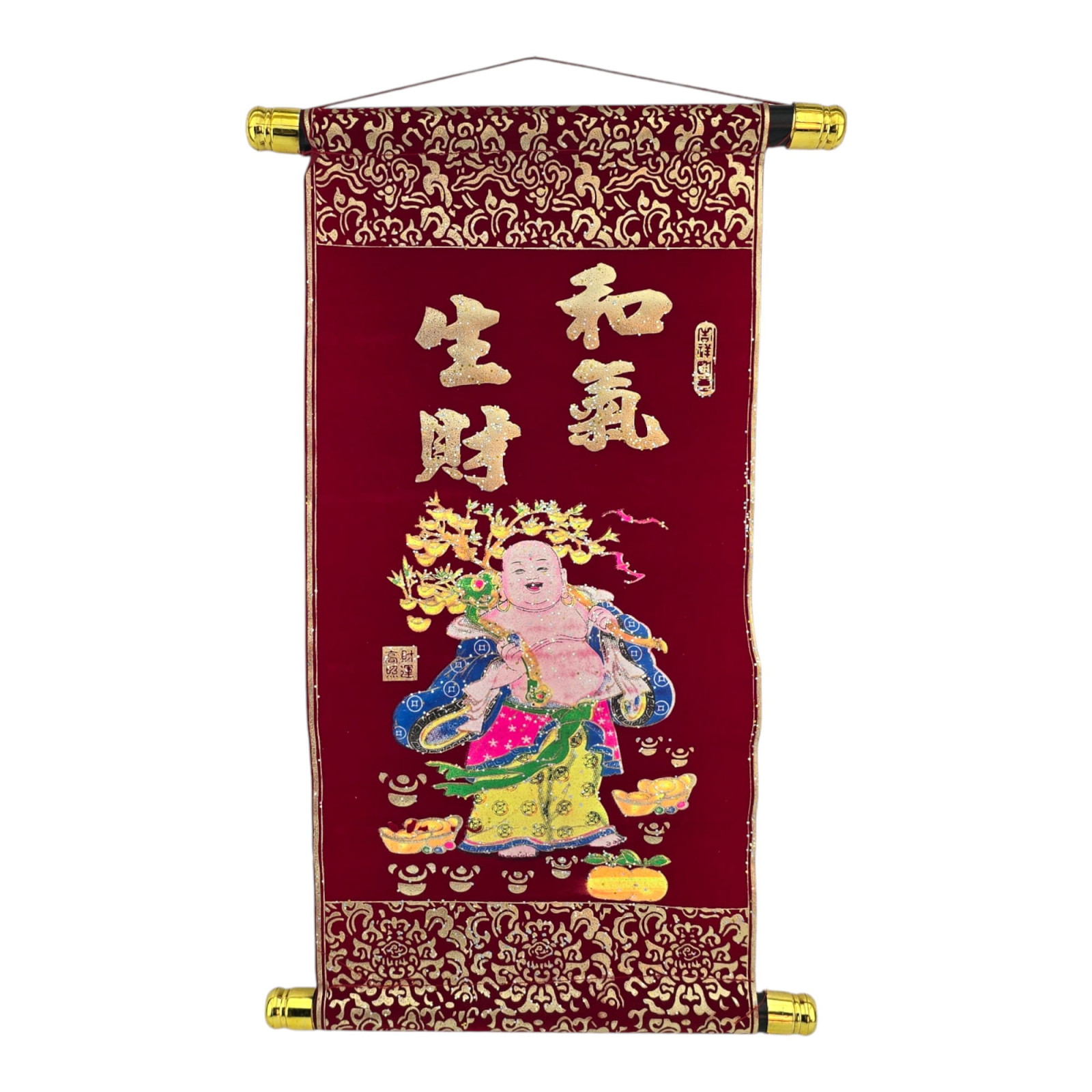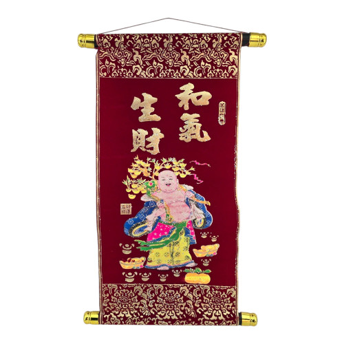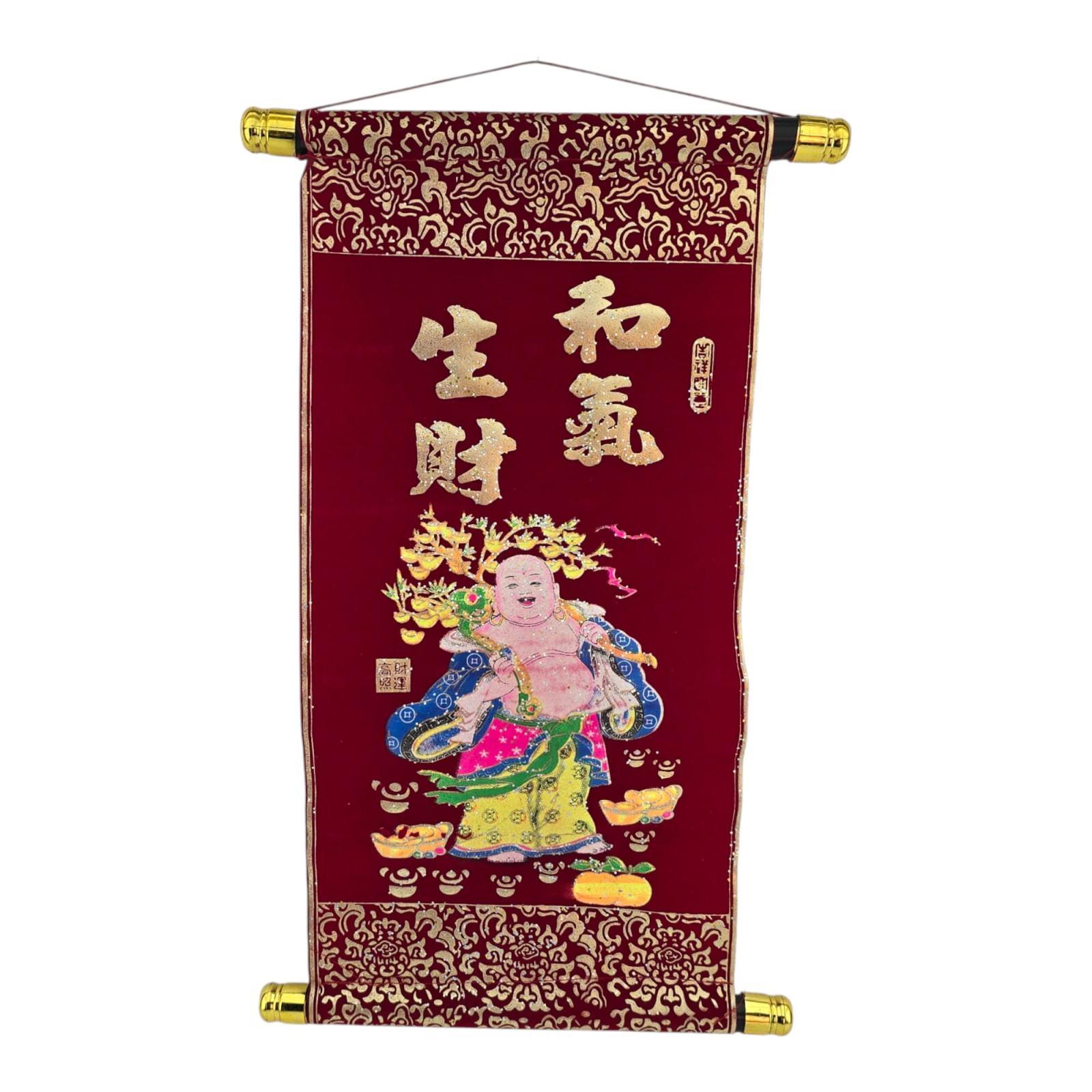 Вертикальне панно у вигляді сувоя із зображенням Хотея (Сміється Будди) та ієрогліфічним написом про гармонію та благополуччя. Червона тканина з декоративним орнаментом та елементами у золотистому кольорі створює яскравий акцент. Панно оснащено шнурком для підвісу та декоративними торцями «під золото». Через особливості виробництва відтінки та дрібні деталі можуть трохи відрізнятись від фото.