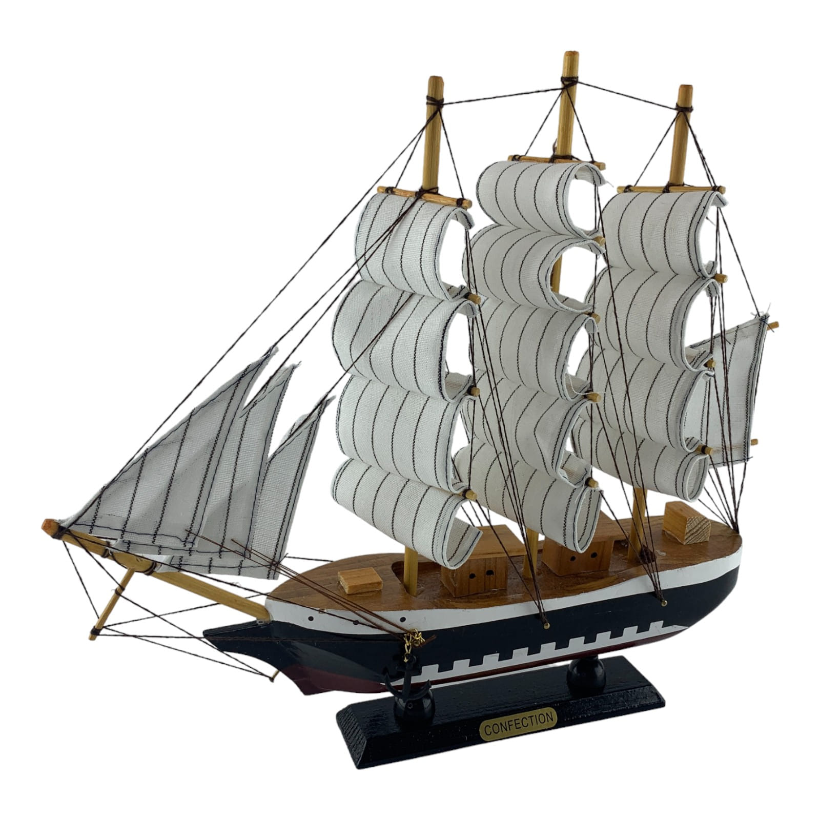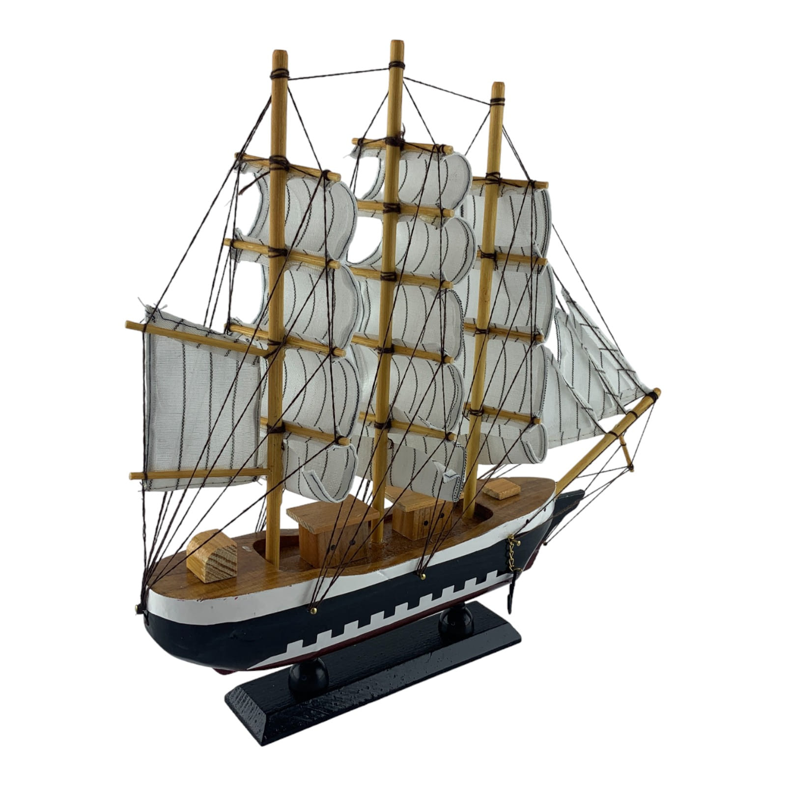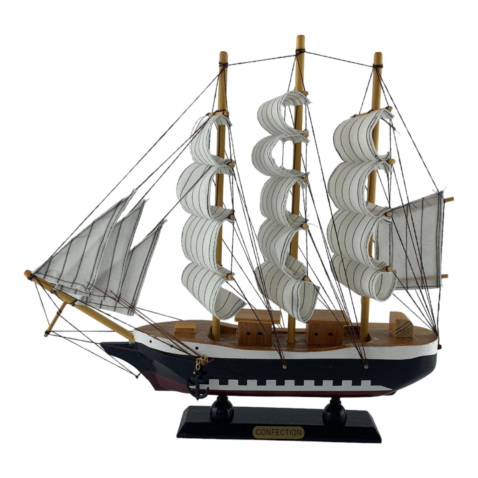 Дерев'яний вітрильник на підставці. Цей елегантний вітрильник – справжній символ свободи та мрії про далекі морські подорожі. Білого кольору з чорною широкою смугою та бардовою знизу, зі світлими вітрилами закликає до нових горизонтів та пригод. Вітрильник на підставці стане не тільки вишуканим елементом вашого інтер'єру, але й нагадуванням про безкраї океани і незабутні моменти. Його компактні розміри роблять його ідеальним для розміщення на столі, полиці або іншому куточку вашого будинку. Два якорі надають цій композиції додаткового морського шарму і символізують стабільність і вірність своїм ідеалам. Цей вітрильник може стати чудовим подарунком для всіх, хто поділяє пристрасть до морських тем і мріє про пригоди на широких водах. Він символізує свободу, мрії та нескінченні можливості. Пориньте у світ морської романтики з нашим вітрильником. Він нагадуватиме вам про великі подорожі та даруватиме натхнення щодня.
