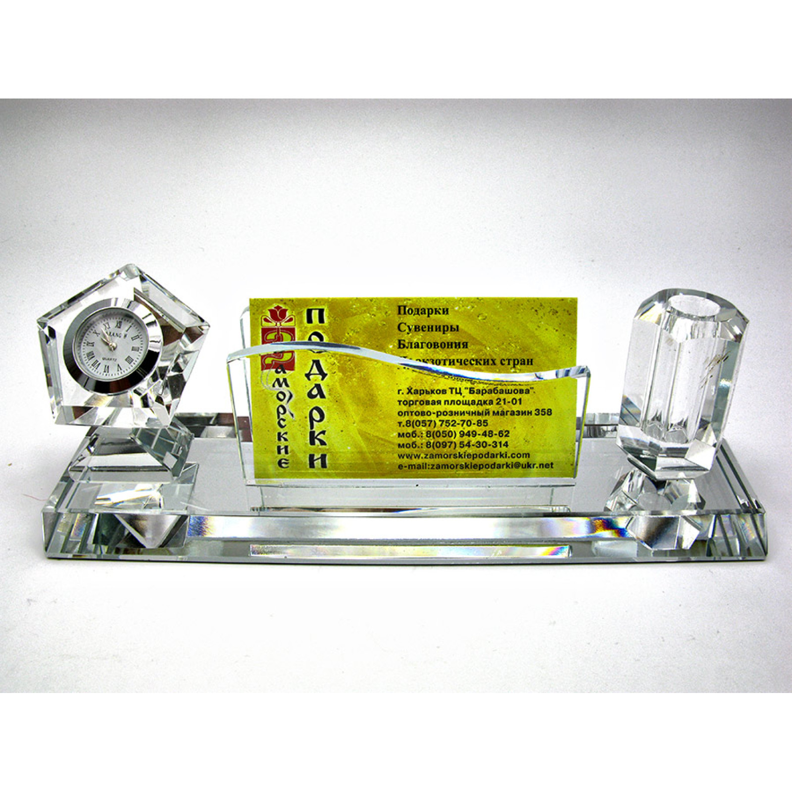 Підставка для ручок кришталева з годинником та візитницею, сувенір, декор, подарунок