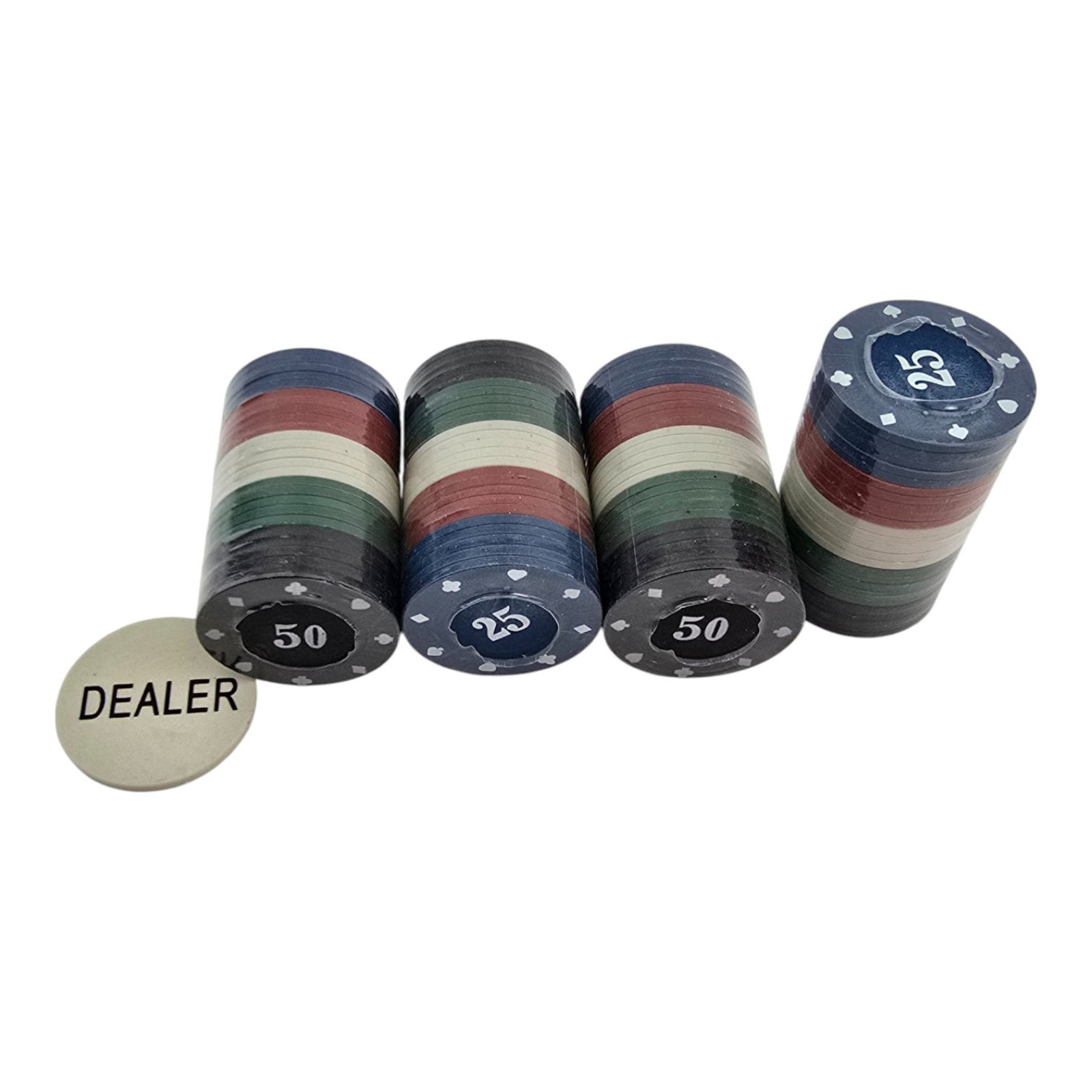 Набір для домашніх ігор покеру. У комплекті 100 фішок п'яти номіналів по 20 штук кожного та фішка дилера. Міцні пластикові фішки зручно заважати та збирати у чарки. Підходить для Техаського Холдему, Омахи та інших карткових ігор.