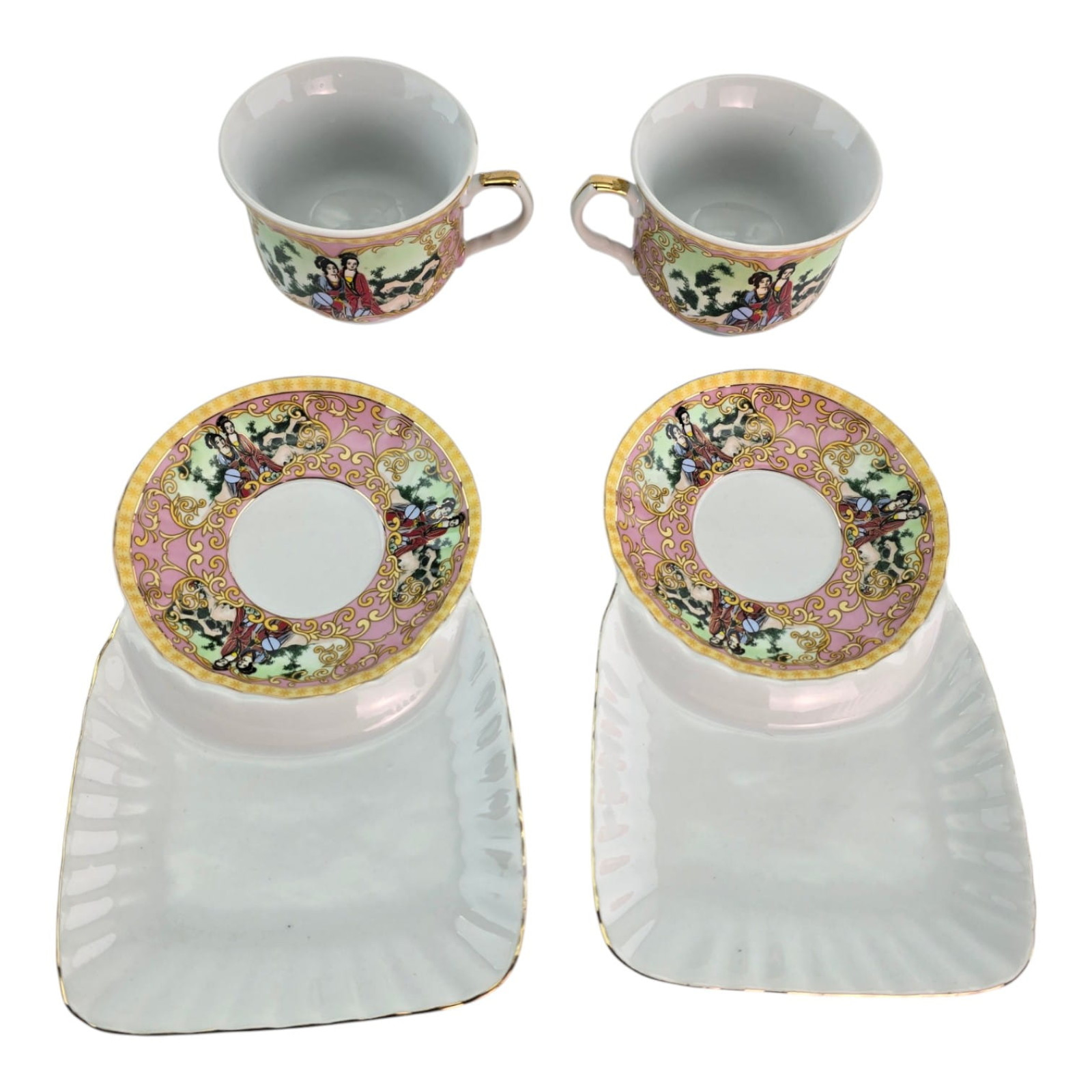 Чашки та блюдця прикрашені яскравим японським декором на рожевий фон: традиційні дівчата в кімоно на тлі природи. Багатий Золотий Орнамент по краю. Страви мають незвичайну квадратну форму з хвилястими краями.