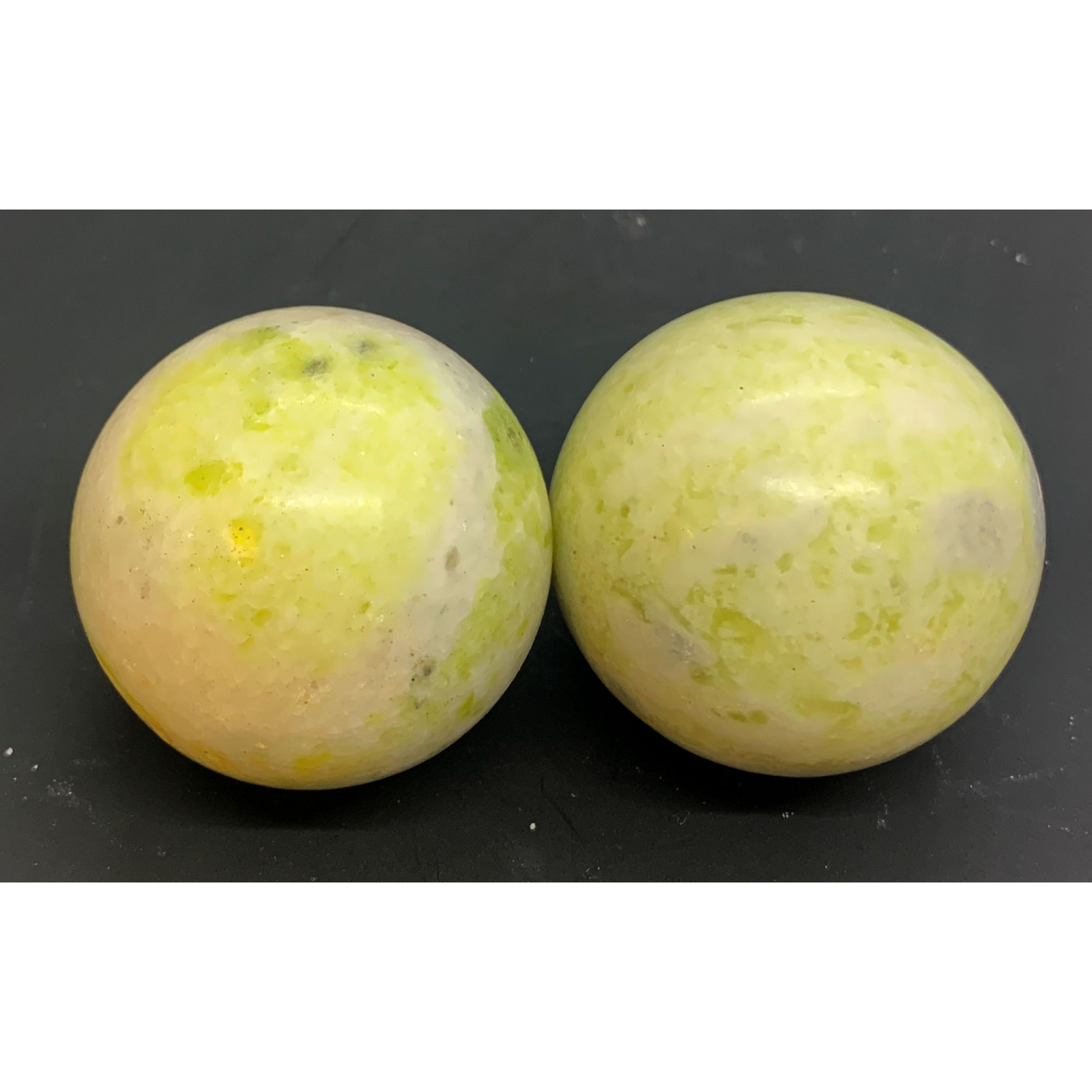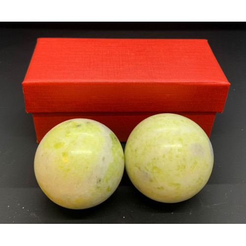 Масажні кулі виконані з якісного нефритового каменю та мають ніжно зелений відтінок, який надає їм особливого шарму. Діаметр кожної кулі становить 50 мм, що робить їх зручними та легкими у використанні.