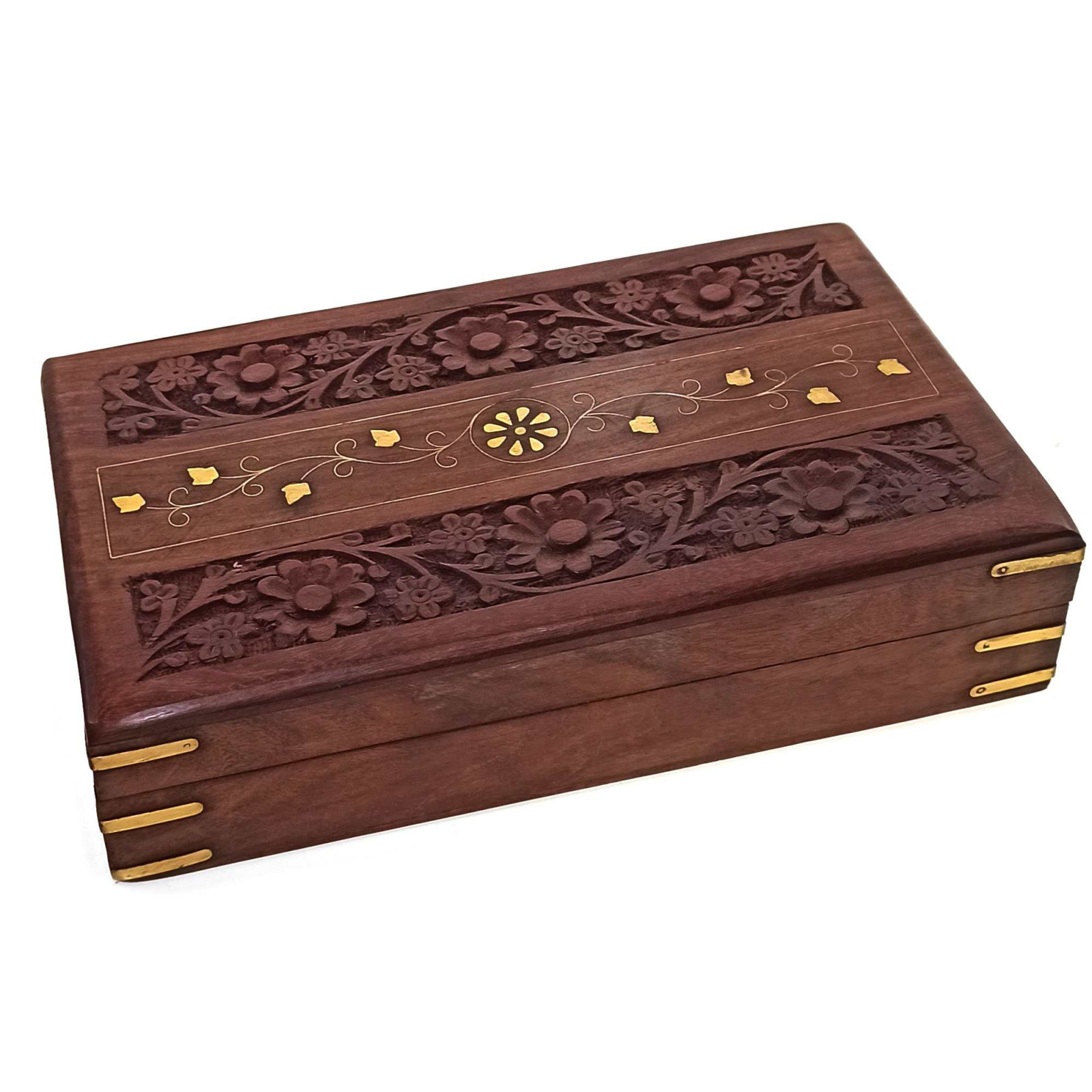 Скринька має розміри 255 мм на 150 мм, що дозволяє зберігати в ній різноманітні речі, такі як прикраси, документи, гроші та інші дрібні речі. Внутрішня частина скриньки оздоблена м'яким оксамитом, що забезпечує безпечне зберігання Ваших цінностей та предметів. Прекрасно підійде для зберігання карток ТАРО. Дерево, з якого зроблена скринька, має природний барвистий відтінок і приємну текстуру, а латунні інкрустації додають їй елегантності та стилю. Скринька може бути використана як для власного користування, так і для подарунка. Купуючи цей товар, Ви отримаєте не лише функціональну річ, а й гарну деталь для Вашого інтер'єру.