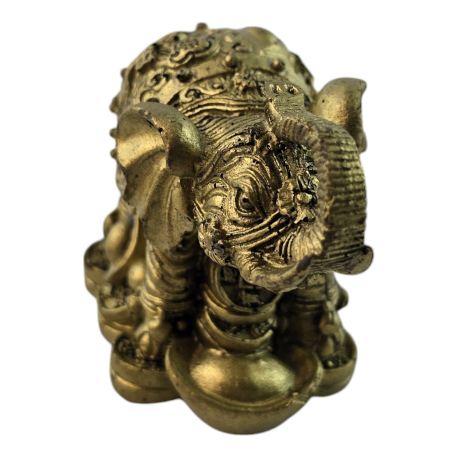 Ця красива статуетка слона у бронзовому кольорі стане чудовим доповненням для вашого інтер'єру або символічним подарунком. Слон стоїть на монетах та чашах багатства, що символізує процвітання, достаток та фінансову стабільність. Виготовлена з полімеру, статуетка має приємний бронзовий відтінок і деталізовану поверхню, що надає їй вишуканості і шарму.