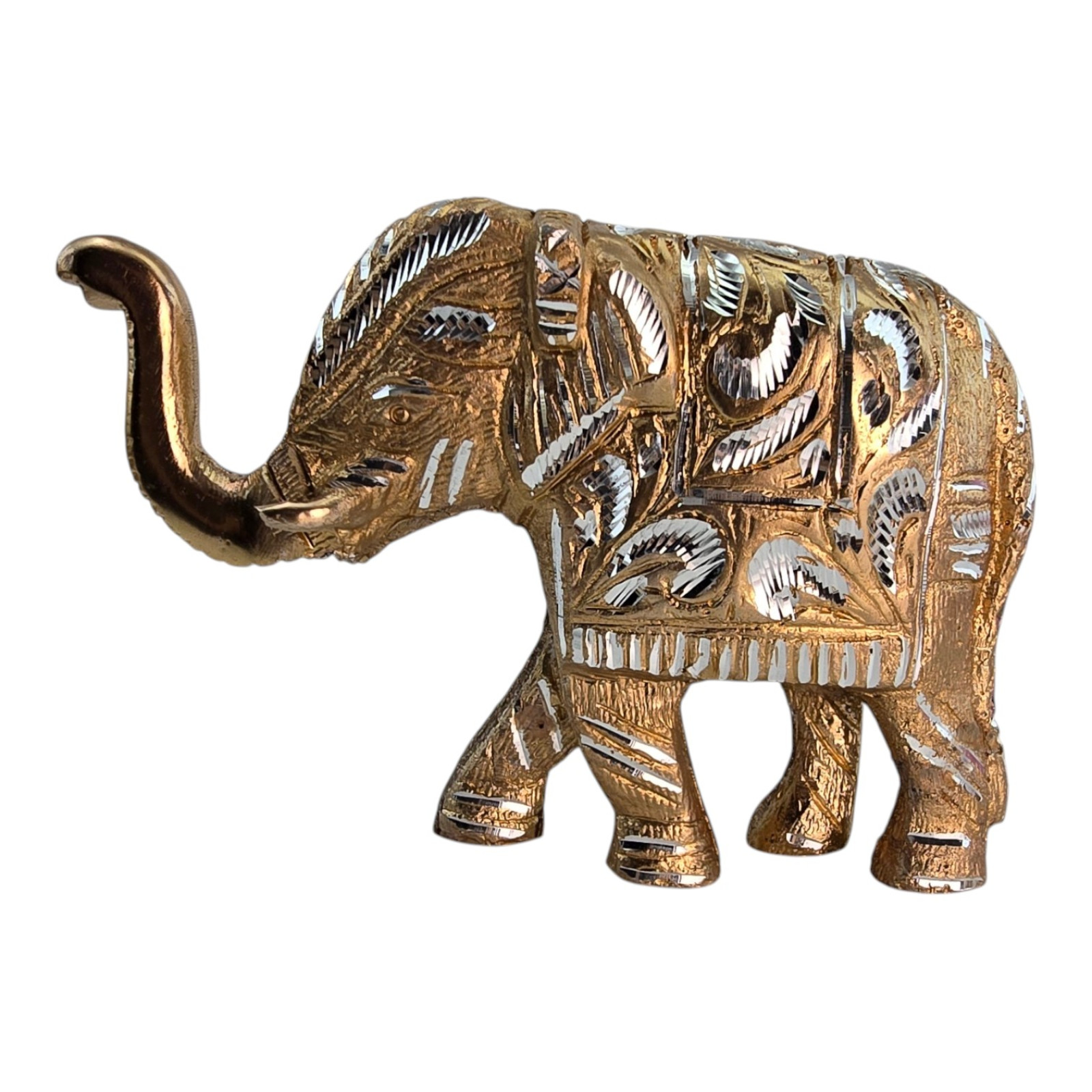 Слоник зображений у русі з піднятим хоботом – класичний індійський символ удачі, захисту та благополуччя. Детальний традиційний орнамент, текстурована поверхня створює ефектний грайливий відблиск під час освітлення.