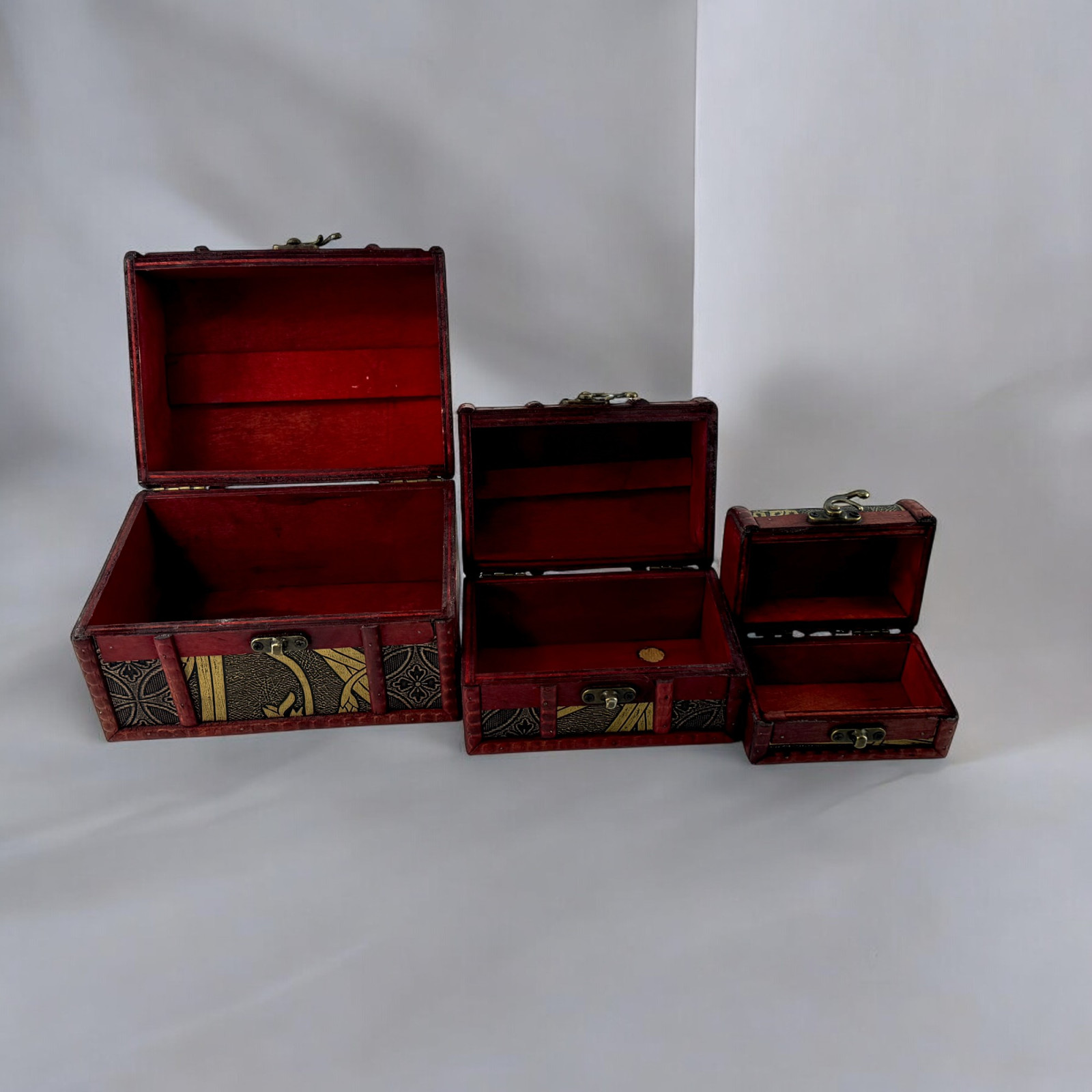 Відкрийте для себе вишуканий набір із трьох скриньок у класичному стилі, який стане прикрасою вашого інтер'єру та чудовим місцем для зберігання цінних дрібниць. Ці скриньки, виготовлені в Китаї, поєднують у собі вінтажну естетику та функціональність, підійдуть для зберігання прикрас, пам'ятних речей або невеликих аксесуарів.