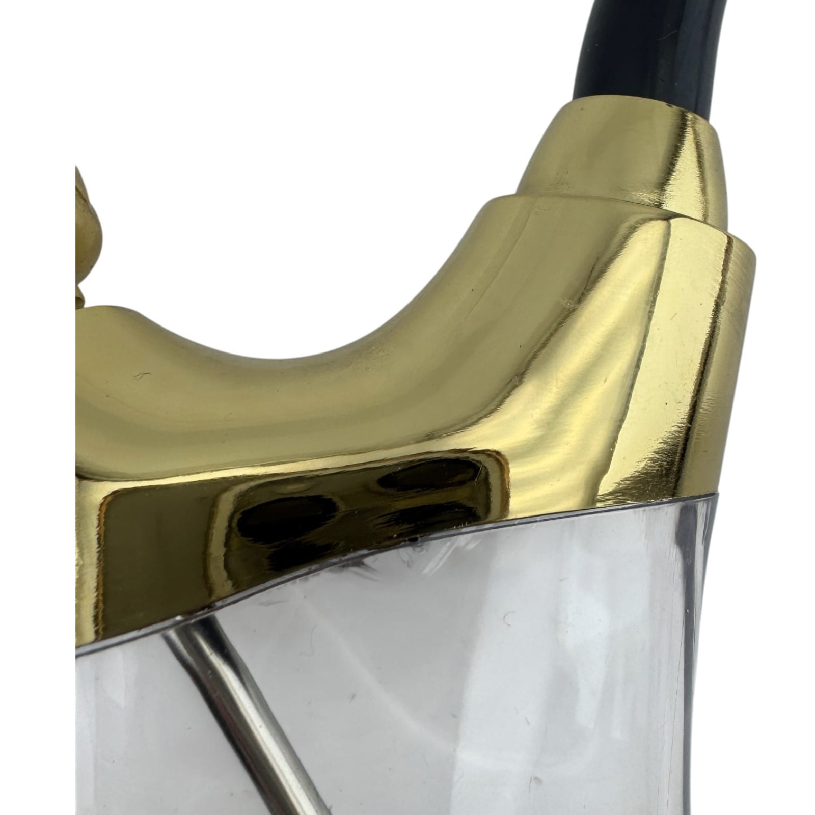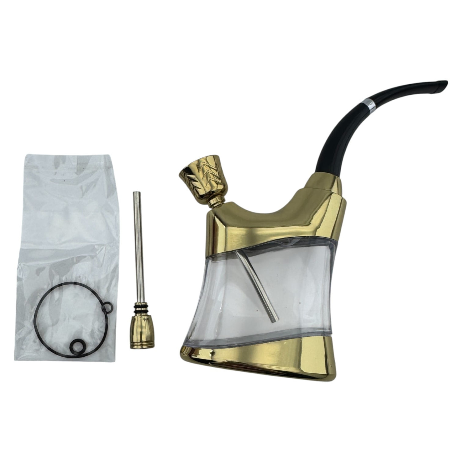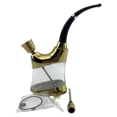Компактний міні-кальян з елегантним золотистим оздобленням - це портативний пристрій з функцією водяної фільтрації диму. Використовується для пом'якшення та охолодження диму під час куріння сигарет або тютюну.