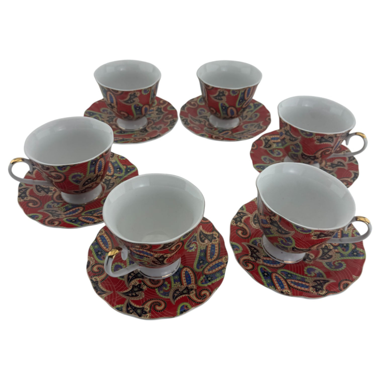 Витончений чайний сервіз від японської марки Yamasen, оформлений у східному стилі з традиційним орнаментом турецькі огірки на насиченому червоному тлі. Кожна деталь сервізу випромінює вишуканість та витонченість, роблячи чаювання справжнім ритуалом.
