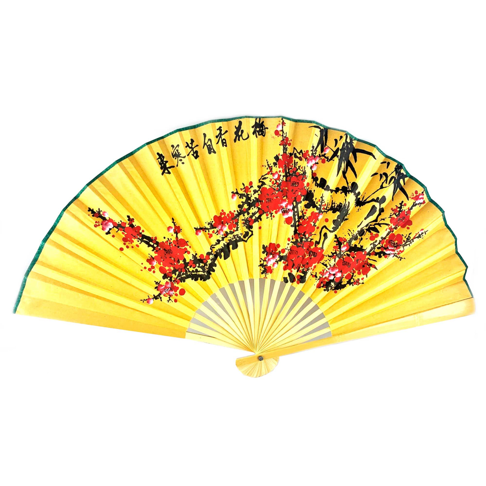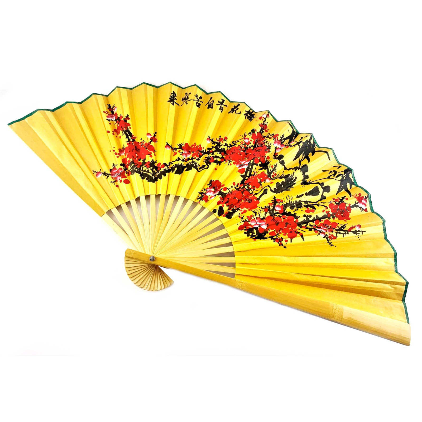 Віяло з натурального бамбука, прикрашені тканиною з чудовим зображенням червоної сакури на жовтому фоні. Цей настінний декор додасть вишуканості та яскравості у ваш інтер'єр, надаючи йому атмосферу затишку та східної чарівності.
