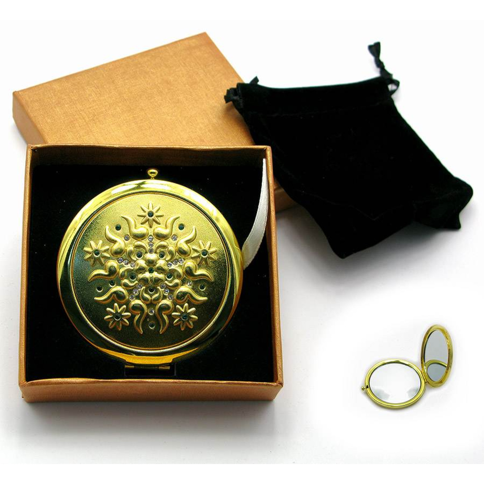 Зеркальце косметичне з камінням золоте напилення (19373 E)(у коробці + чохол), кишенькове дзеркало, косметичне дзеркало, аксесуар для сумки