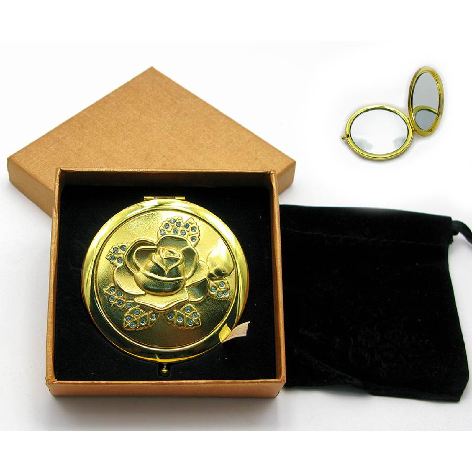 Зеркальце косметичне з камінням золоте напилення (19373 I) (у коробці + чохол), кишенькове дзеркало, косметичне дзеркало, аксесуар для сумки