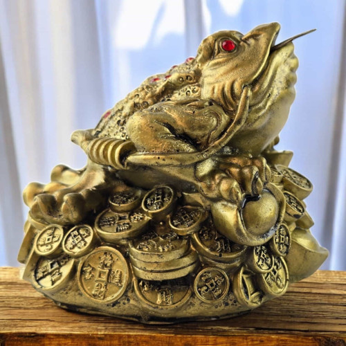 Ця фігурка зображує знамениту китайську трилапу жабу, що символізує залучення багатства та удачі. Виконана з полімеру та прикрашена безліччю китайських монет, фігурка виглядає особливо ефектно та стане яскравим акцентом вашого інтер'єру. Жаба з монетами традиційно використовується у феншуй, щоб приносити добробут та захищати фінансову стабільність.