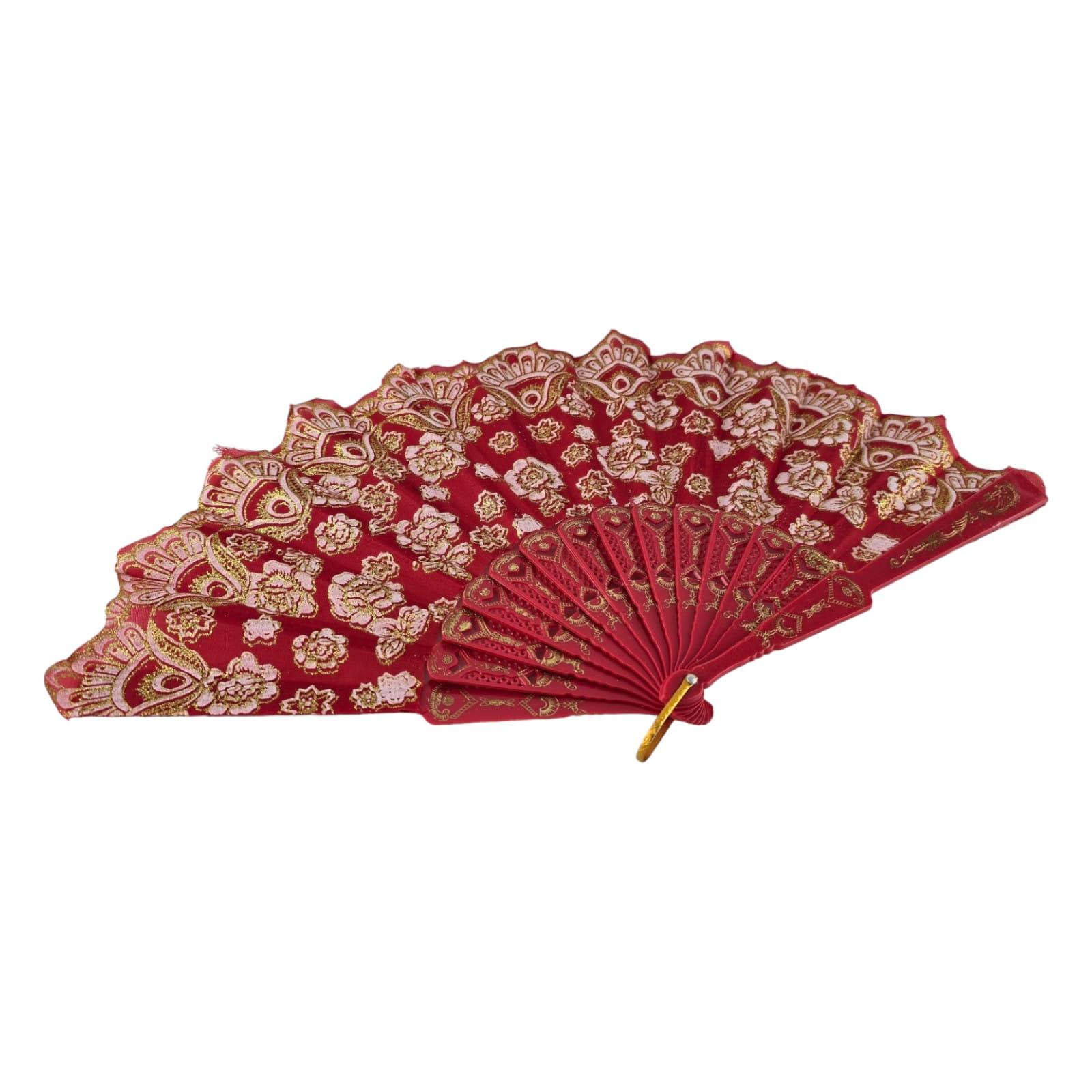 Веер изготовлен из пластика и покрыт красной тканью, создавая эффектный контраст. Золотистые цветы, ярко выделяющиеся на фоне красного, добавляют блеск и роскошь, делая веер по-настоящему уникальным.
